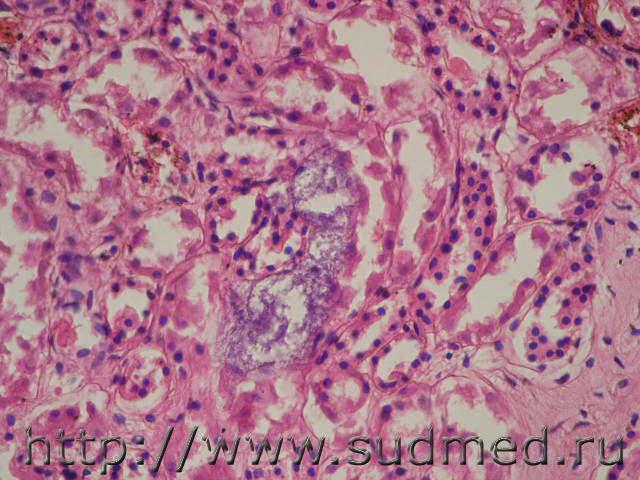 тубулоинтерстициальный нефрит с поражением части клубочков, очагами коагуляционного некроза. ОСЛ: Уремия: серозно-геморрагический менингит, интерстициальная пневмония, серозный межуточный гепатит, серозный миокардит и перикардит. Очаги коагуляционного некроза в миокарде. Очаговый некронефроз. 1.В пределах представленных фотографий почек интерстициального нефрита не вижу.На втором фото это не коагуляционный некроз.При гломерулонефритах всегда будет воспаление в интерстиции. 2.Так называемый серозный миокардит при желании - можно найти у любого трупа. 3.Коагуляционного некроза в миокарде нет.Это грибы. 4."Очаговый некронефроз" к уремии не приведёт. Ваш патологоанатом = 0. |