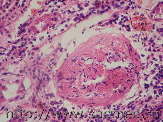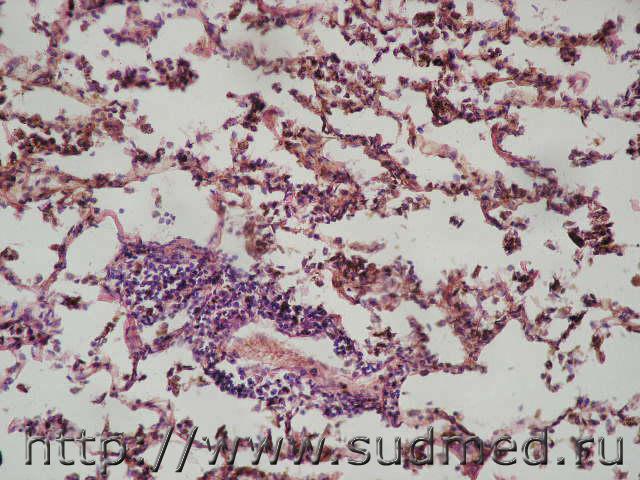 Молодой человек, 1980гр. Про истощение неизвестно. Легкие гнилые, периваскулярные плотные муфты (небольшое кол-во)из круглых клеток с единичными макрофагами, нет ни отека ни расст-в. Палочек и нитей не видно, мелкие светло-фиолетовые шарики или почти шарики. Мнение ПА то же грибы. Сегодня покрасят, в понедельник расскажу о результате окраски. ПА заподозрил наличие гломерулонефрита, а вы как думаете?