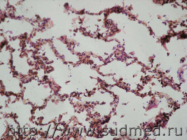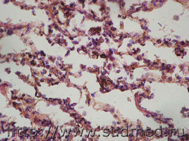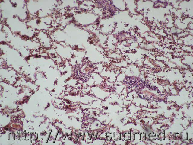 Вердикт ПА:О.тубулоинтерстициальный нефрит с поражением части клубочков, очагами коагуляционного некроза. ОСЛ: Уремия: серозно-геморрагический менингит, интерстициальная пневмония, серозный межуточный гепатит, серозный миокардит и перикардит. Очаги коагуляционного некроза в миокарде. гемосидероз легких. мускатный фиброз печени. цианотическая индурация селезенки. Очаговый некронефроз. ОГМ и оболочек. Грибов не обнаружено. Зав.отд.считает, что в миокарде и т.д. колонии микроорганизмов. Мне кажется, они д.б.темнее И еще, зав говорит, что почка не такая уж страшная, что бы вызвать уремию. Ниже фото легких Эскизы прикрепленных изображений |