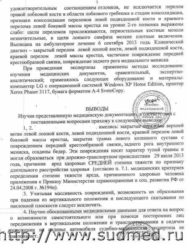Добрый вечер, уважаемые специалисты. Помогите разобраться , правильно ли определена степень тяжести при ДТП. 29.07.13 в результате дтп девушка 20 лет попала в городскую больницу, где на основании рентгенснимков заключение перелом лонной кости слева, возможен перелом лонной кости справа, разрыв симфиза (со слов доктора), лежим в стационаре месяц не вставая , не поворачиваясь на бок, по ходу лечения жалобы на сильную бол внизу поясницы и в левом колене. Врач поясняет что это от переломов, пройдет, когда они срастутся. 03.09.13 берем направление на МКТ таза и МРТ левого коленного сустава. заключение МКТ таза: перелом верхней ветви левой лобковой кости в стадии почти полнойконсолидации с удовлетворительным соотношением отломков, не исключается перелом правой лобковой кости в области лобкового гребешка в стадии консолидации, признаки консолидации переломов левой позвздошенной кости и краевого перелома левой массы крестца на уровне S2-позвонка выражены слабо: щели переломов прослеживаются, в щели лонного симфиза-мелкие плотные включения. Заключение МРТ коленного сустава: картина частичного повреждения передней крестообразной связки(в области задних отделов), повреждения заднего рога медиального мениска, контузии костного мозга задних отделов медиального мыщелка бедренной кости, частичного повреждения медиальной головки икроножной мышцы в месте ее прикрепления. 06.09.13 по нашей просьбе (так как ни садиться ни присаживаться нам не разрешили, а отпуск у меня закончился) по нашей просьбе дочь выписывают в удовлетворительном состоянии на амбулаторное лечение по месту жительства.По этим заключениям нам определен вред средней степени тяжести. 17.10.13 (2месяца и 20 дней прошло)проводим повторно МКТ пояснично-крестцового отдела позвоночника и костей таза. Заключение: в левой подвздошенной кости определяется частично консолидированный перелом (диастаз между костными отломками по нижнему краю до 3мм на протяжении 10мм) на остальном протяжении консолидация хорошая. перелом боковых масс крестца на уровне S2 слева практически без динамики. Перелом верхней ветви лонной кости в стадии полной консолидации. Пока дочь находится на справке, садиться не разрешают, так как перело боковых масс крестца без динамики уже 3 месяца. Пожалуйста, проконсультируйте, правильно ли определена средняя степень тяжести. И если относится к тяжкому вреду здоровья то на что можно сослаться.