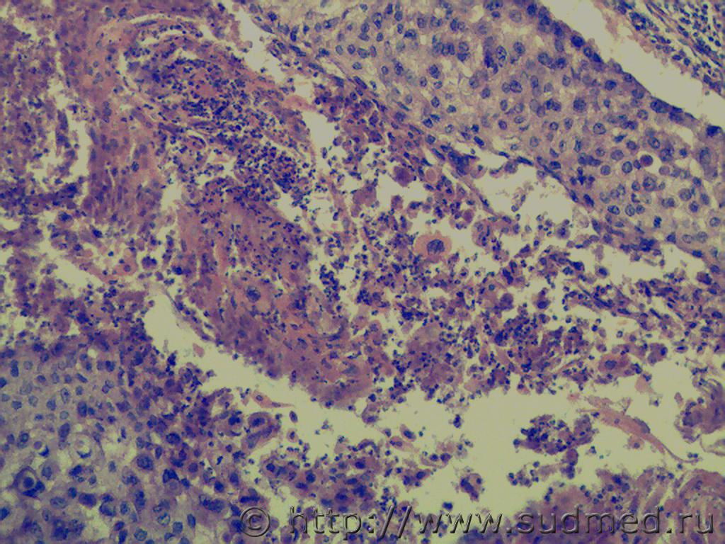 Добрый день, ув.коллеги! В данном случае нарушение базального слоя не видно, имеет место гиперплазия шиповатых клеток с полиморфизмом и митотической активностью ядер. Видны очаги кератинизации и кератиновых кист. На поверхности видны очаги изъязвления с клеточными детритами.