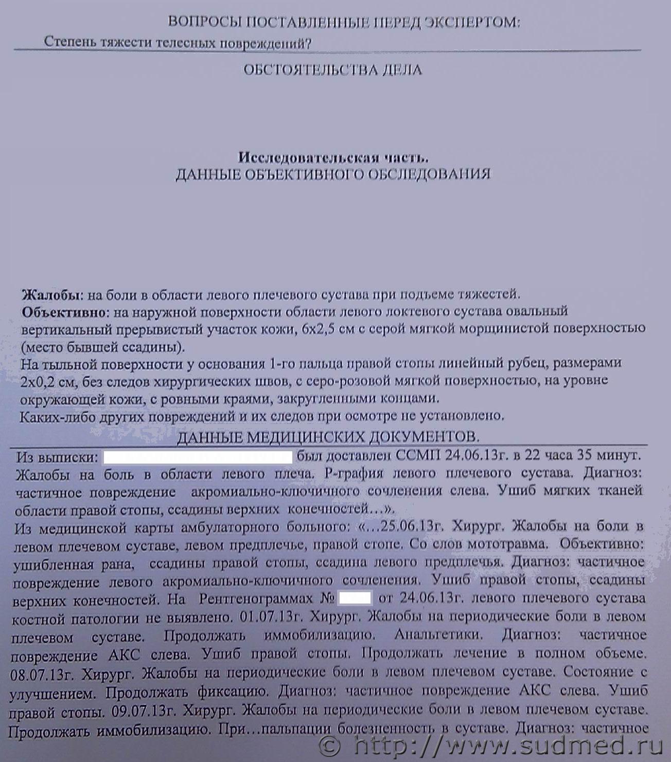Частичное повреждение акромиально-ключичной связки достаточно не подтверждено объективными медицинскими данными: 1.не выявлено характерных рентгенологических признаков травмы АКС (нарушение соотношений костей в акромиально-ключичном сочленении: при разрыве связки это видно и по снимку только одной этой области, при частичном повреждении желательно было сделать снимок правой и левой этих областей на одной пленке), 2.не выполнялись МРТ (идеально) или УЗИ (несколько хуже, но, в умелых руках - достаточно информативный метод оценки состояния связок). 3.осмотры врачей крайне невнятные - не описаны характерные тесты, даже конфигурация данной области. 4.экспертом при осмотре никак не описано состояние и функция акромиально-ключичного сочленения, т.е. совершенно неясно есть какая-то динамика или нет (при действительном наличии такой травмы и указанном лечении должна быть положительная динамика с нормализацией или значительным улучшением функции в исходе). 5.не описана рентогенологическая картина состояния плечевого, акромиально ключичного суставов и нет информации о их состоянии до предъявляемой травмы -из амбулаторной карты и т.п. мед.документов (если у человека банальный артроз, плечелопаточный периартрит и т.п. - движения в суставах (акромиально-ключичном, плечевом) могут быть ограничены без всякой травмы.