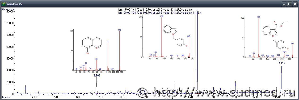 Добрый день! На вашей хроматограмме присутствует целый ряд артефактов (включая компонент, соответствующий пику с RT=11.33 мин) вещества QCBL-BZ-F (так оно называется в белорусском перечне НСПВ):Помогите идентифицировать пик на 11,33 мин. Заранее спасибо. Непосредственно действующее вещество, видимо, полностью развалилось в инжекторе (поэтому вы и не видите соответствующего пика) - рекомендую заменить лайнер... |