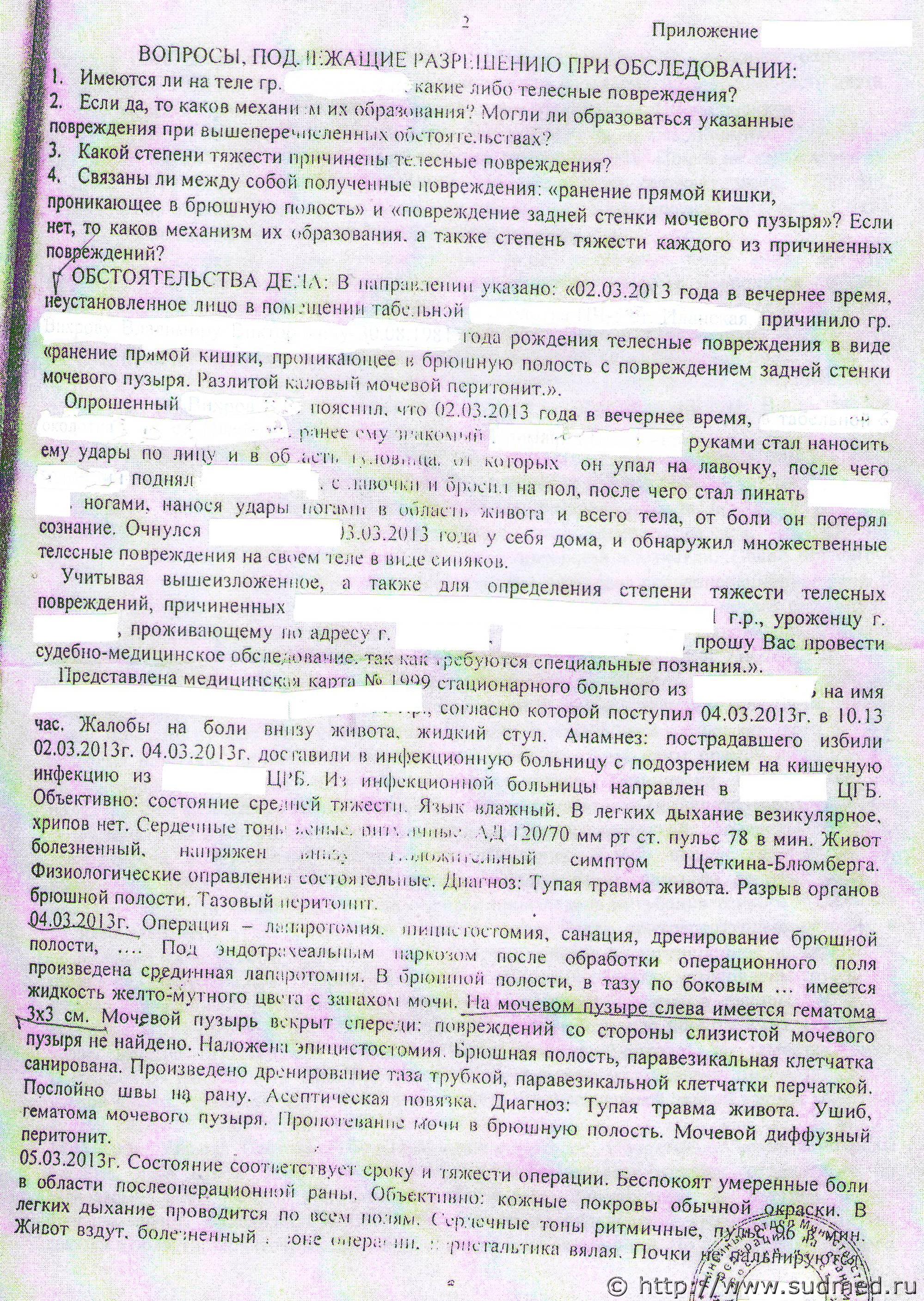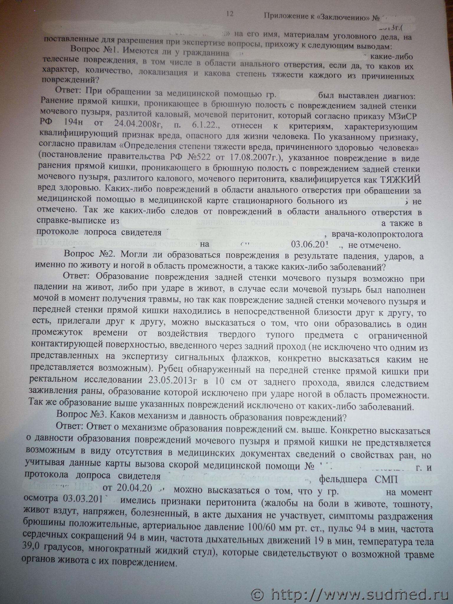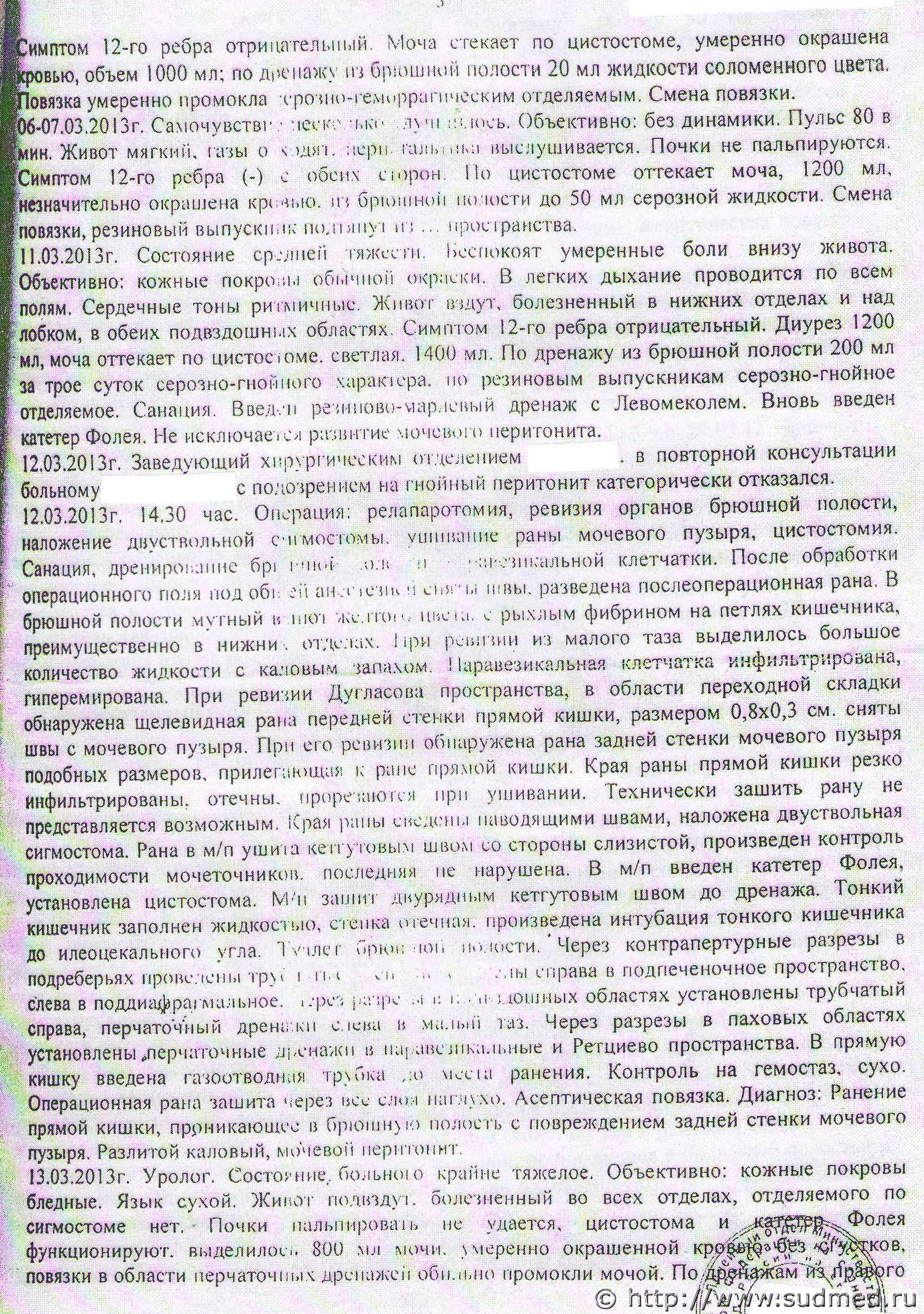 Здравствуйте. Помогите пожалуйста разобраться. Коротко: 02.03.13 выпивали, 03.03.13 заболел живот, жидкий стул, на скорой доставили в больницу, при осмотре ректально и пальпировано хирург ничего не обнаружил, отправил в инфекцию, 04.03.13 делают операцию, диагноз-тупая травма живота, ушиб, гематома мочевого пузыря слева, мочевой пузырь вскрыт спереди, повреждений со стороны слизистой м\п не найдено, послеоперационный период протекает нормально, 11.03.13 состояние средней тяжести, вводят резино-марлевый дренаж с левомеколем и вновь введен катетер Фолея, 12.03.13 вторая операция, обнаруживают щелевидную рану передней стенки прямой кишки, размером 0,8х0,3 см при ревизии мочевого пузыря обнаруживают щелевидную рану таких же размеров, суд.мед эксперт сделал вывод, что это могло произойти от введение в анальное отверстие твердого тупого предмета 02.03.13г (при этом анус не поврежден), далее в экспертизе появляется сопутствующий диагноз-повреждение задней стенки уретры. Мог ли человек с диагнозом ранение прямой кишки проникающее в брюшную полость с повреждением задней стенки мочевого пузыря. Разлитой каловый, мочевой перетонит прожить со 02.03.13 по 12.03.13г? при этом ни 04.03.13, ни 12.03.13 при ревизии брюшеной полости каловых масс и мочи не обнаружено, а только жидкость с запахом кала и мочи обнаружена 12.03.13(при второй операции) со слов врача. В экспертизах не описаны морфологические свойства и характер раны. Помогите пожалуйста разобраться, мы никак не можем добиться комиссионной сложной судебно-медицинской экспертизы. ____________ |