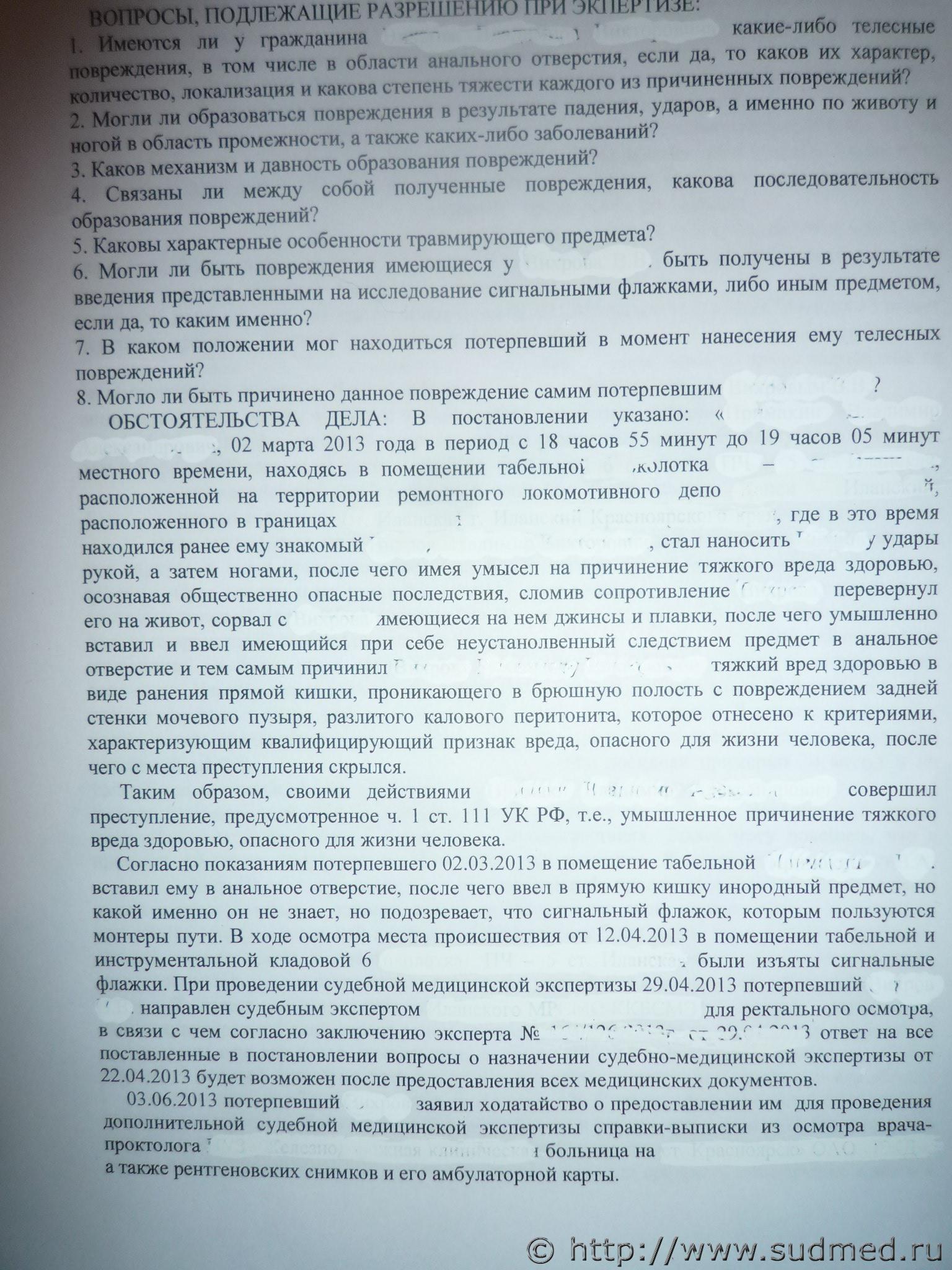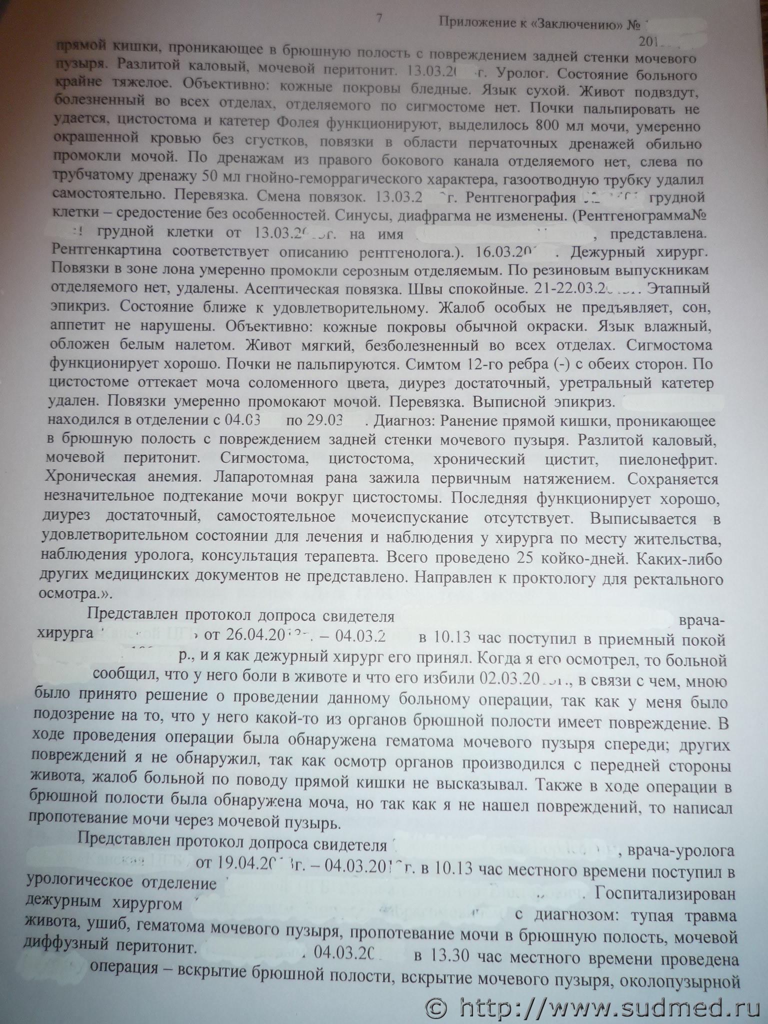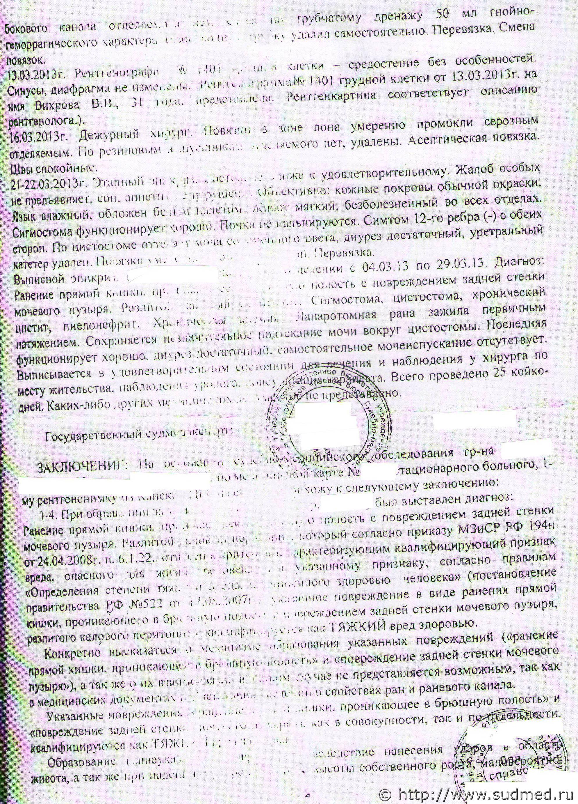 Здравствуйте. Помогите пожалуйста разобраться. Коротко: 02.03.13 выпивали, 03.03.13 заболел живот, жидкий стул, на скорой доставили в больницу, при осмотре ректально и пальпировано хирург ничего не обнаружил, отправил в инфекцию, 04.03.13 делают операцию, диагноз-тупая травма живота, ушиб, гематома мочевого пузыря слева, мочевой пузырь вскрыт спереди, повреждений со стороны слизистой м\п не найдено, послеоперационный период протекает нормально, 11.03.13 состояние средней тяжести, вводят резино-марлевый дренаж с левомеколем и вновь введен катетер Фолея, 12.03.13 вторая операция, обнаруживают щелевидную рану передней стенки прямой кишки, размером 0,8х0,3 см при ревизии мочевого пузыря обнаруживают щелевидную рану таких же размеров, суд.мед эксперт сделал вывод, что это могло произойти от введение в анальное отверстие твердого тупого предмета 02.03.13г (при этом анус не поврежден), далее в экспертизе появляется сопутствующий диагноз-повреждение задней стенки уретры. Мог ли человек с диагнозом ранение прямой кишки проникающее в брюшную полость с повреждением задней стенки мочевого пузыря. Разлитой каловый, мочевой перетонит прожить со 02.03.13 по 12.03.13г? при этом ни 04.03.13, ни 12.03.13 при ревизии брюшеной полости каловых масс и мочи не обнаружено, а только жидкость с запахом кала и мочи обнаружена 12.03.13(при второй операции) со слов врача. В экспертизах не описаны морфологические свойства и характер раны. Помогите пожалуйста разобраться, мы никак не можем добиться комиссионной сложной судебно-медицинской экспертизы. ____________ |