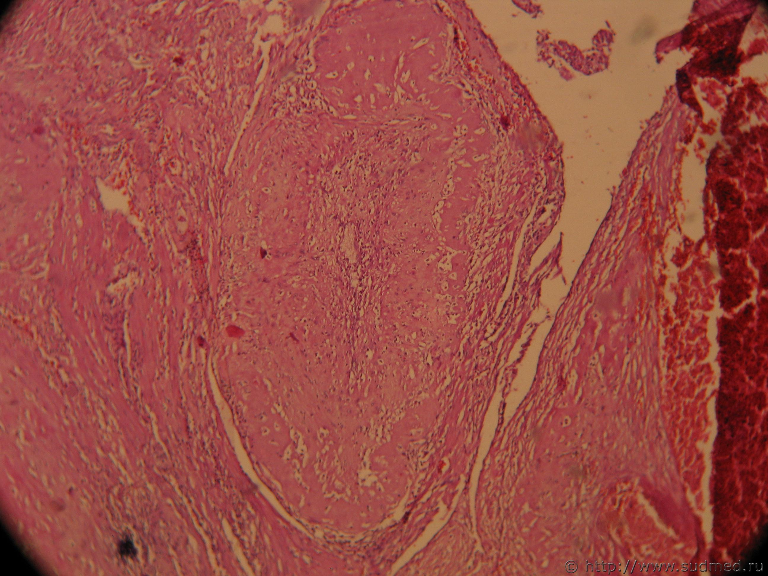Фото 1: Вместо эндометрия некрозы, крововизлияния, тромбоз сосудов, кое-где с некрозом сосудистых стенок, лейкоцитарные инфильтраты и гиалинизированные ворсины хориона. Фото 2: гиалинизорованная ворсина |