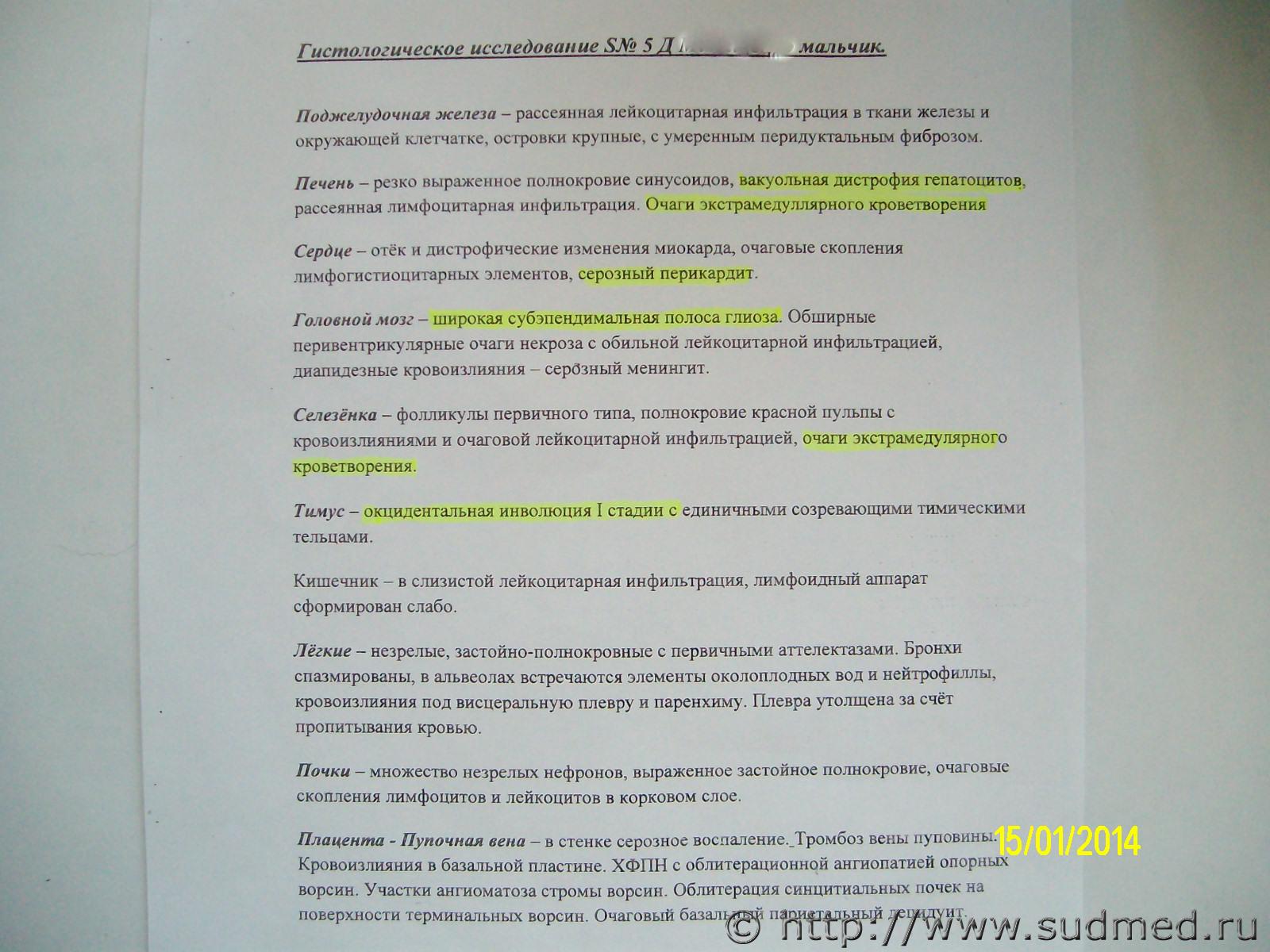 Для ответа на поставленные Вами вопросы в сообщении №10 необходимы Ваша карта из женской консультации,история родов,история развития новорожденного и обязателен пересмотр гистологических препаратов. В пределах форума с этим не разобраться.Кроме судебно-медицинского эксперта необходимы акушер-гинеколог,неонатолог,патологоанатом. Гадать не буду. |