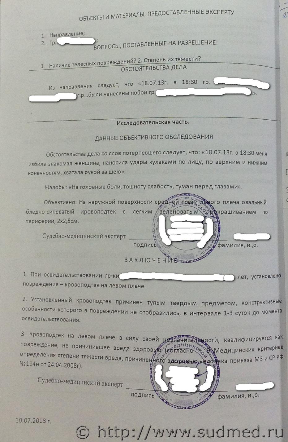 Ну и? Согласно Заключению есть ОДНО повреждение - кровоподтек на левом плече. Это есть ФАКТ. Согласно телефонограммам указан ДИАГНОЗ, который не подтвержден описанием повреждений. Иными словами, данный диагноз - НЕ ФАКТ. Никаких противоречий нет - эксперт с легким сердцем оценит кровоподтек и забудет про диагноз в телефонограмме как несущественную информацию. Для иного разговора нужны медицинские документы, в которых ОПИСАНЫ повреждения, указанные в диагнозе из телефонограммы. Если таких документов нет - не о чем говорить Возникает вопрос насчет кровоподтека, который обнаружил эксперт. Телесные повреждения были нанесены 08.07.2013 в 15:30. 10.07.2013г в 13:15 фиксирует кровоподтек овальный бледно-синеватый с ЗЕЛЕНОВАТЫМ ПРОКРАШИВАНЕМ по периферии 2х2.5 см. Каков срок цветения данного кровоподтека? Разве за 46 часов он может иметь зеленоватое прокрашивание? Про медицинские документы из травмпункта, я писала ранее. Они отправлены на повторную экспертизу. То есть вы хотите сказать, что имея медицинские документы с локализацией кровоподтеков из травмпункта и первоначальной экспертизы, эксперт не сможет найти противоречий в них и все равно укажет в повторной экспертизе о наличии одного телесного повреждения? Я не понимаю зачем повторку вообще назначили, противоречия и так можно было устранить, а эксперта то хоть в суде допрашивали? Назначили, потому что потерпевшая указывает на то, что ее били головой об голову. У нее сотрясение головного мозга. Эксперта еще не опрашивали. На первом заседании опросили потерпевшую и назначили экспертизу. |