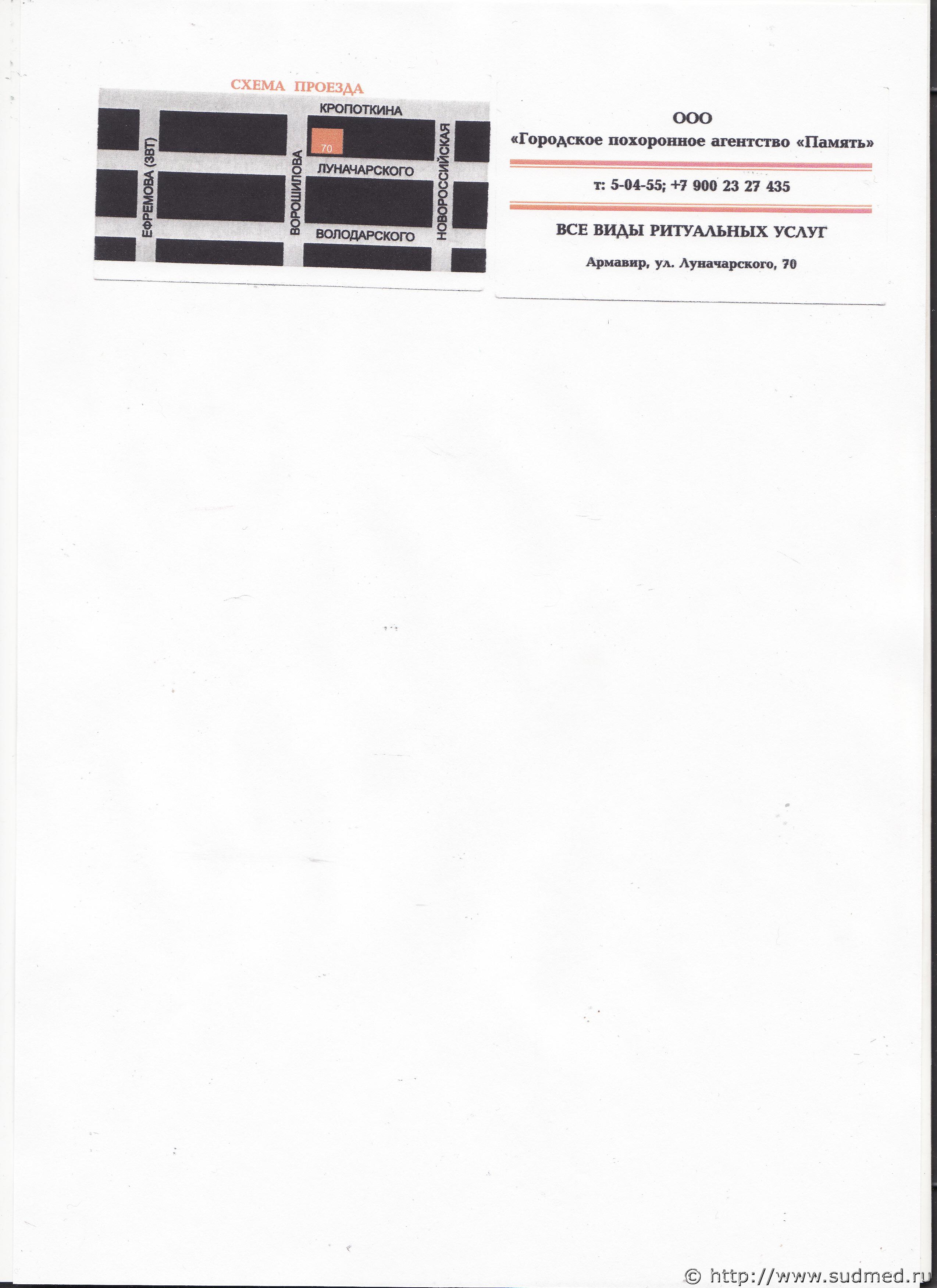 У нас нет отделения по ул. Луначарского 70. Наше отделение расположено по ул. Энгельса, 2. раздел контакты, там адрес И кстати "Память" не Ердеева контора. Мы проводили внутреннюю проверку и если выяснялось, что эксперт как то связан с ритуалкой, предлагали ему выбрать либо бизнес либо работа. Есть те, кто остался в бизнесе. Вот доказательство вашей халатной проверки. Почему то в частном доме, вместе с ритуалкой, находилась суд.мед.экспертиза и под одним номером телефона. Чудеса, да и только. Вы это бревно при проверке не заметили, а у других щепу выискиваете. P.S. Это на всякий случай, что бы не было подозрений о не состоятельности представленных выше визиток.  |