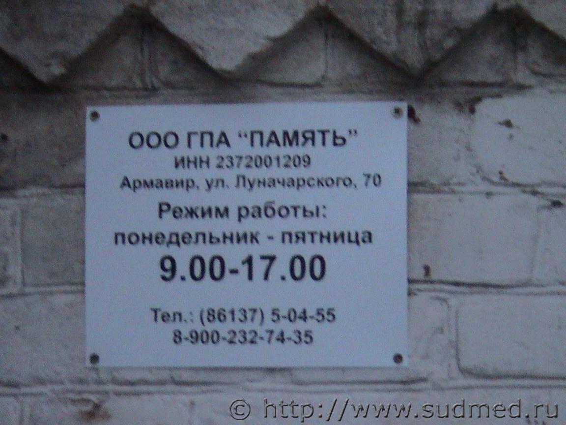 Еще раз повторюсь: у нас нет отделения по ул. Луначарского 70. Нельзя просто взять и перенести отделение в другое здание. Дубровин был на проверке 14го января вроде, вы ему это показали? Ведь он с вами общался. Получается он тоже в "теме"? Ув. SME-kuban, я знаю что и в природе не должно там быть этой богодельни, но оно было и без вашего на то ведома. А развёл этот бардак заведующий Армавирским отделением СМЭ г-н Ердеев Е.А.(это тот, который по вашим словам отношение не имеет к ритуальному бизнесу) На фото и визиткам, которые он раздавал и раздаёт сотрудникам полиции, по русски чётко написано. Присмотритесь пожалуйста! Это один ваш из многих косяков вашей же работы. Второе - если вы настоящий юрист Бюро СМЭ, то вы должны знать когда была реорганизация Здравоохранения КК в Министерство здравоохранения КК и не надо вешать 14 января 2014г. на плечи нового человека. Аббревиатура Бюро СМЭ КК на снимке, повешена на заборе с января 2012 года в момент открытия Ритуальных услуг "Память" и причём тут проверка Дубровина в 2014 г.? Брехня с вас лезет во все дырки, Правильно спрашивают у вас доказательства, хоть какие нить. Конкретного ведь ничего ни на Бусуйка, ни на Сковоротникова с Чернышовым и пр. у вас опять же нет кроме фотографий из семейных альбомов Дубровина и ВСЁ!!! За полтора месяца вы только компромат на семейных слайдах на пачковали, а языком на трепали, Левитан отдыхает.  |