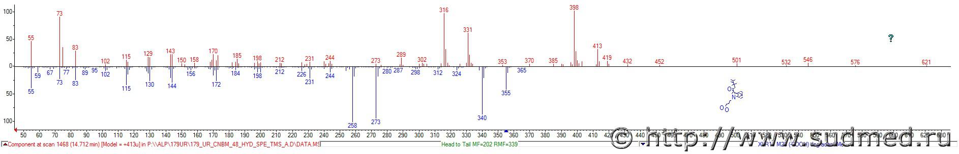 я ориентируюсь по гидрокси-метаболитам, у меня при мизерной дозе этого вещества через 8 часов довольно крупный пик 314 массы (моногидрокси-ТМС), еще есть 402 масса, и 232 (из вновь обнаруженных, то что я выкладывал на прошлой странице). то есть схема в общем-то аналогична ur-144, а здесь этого вообще нету. и потом Вы сами пишете откуда мог взяться метиловый эфир, если метилирование не проводилось вот мне все же сдается что здесь собака порылась...понимаете догадки догадками, на любой спектр можно нарисовать пару десятков структур и штук пяток вроде бы логичных схем распада, это мы с коллегами уже проходили, когда дизайны появлялись по 2-3 в неделю. но есть так называемые дополнительные факторы которые нельзя не учитывать и они важнее придуманных структур. Вот мне кажется как-то маловероятно чтобы вещество выводилось не в форме конъюгата с глукоруновой кислотой, а в виде метилового эфира. такое вообще бывает, можете привести примеры, которые описаны были бы в литературе? |