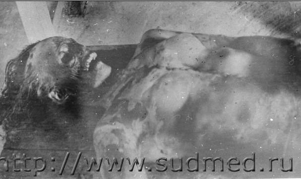 Здравствуйте! Здесь представлены 2 фотографии трупа Людмилы Дубининой, участницы похода тур группы Дятлова в 1959 году на северном Урале. По факту гибели данной группы было заведено уголовное дело, которое было закрыто в частности потому, что так и не были установлены травмирующие факторы. На первой фотографии - труп Л.Д. сразу после обнаружения её в ручье под слоем наметённого снега. На второй - её же труп в морге. Труп нашла поисковая группа через месяц после смерти в конце февраля. Тело пролежало около месяца в текущем ручье.