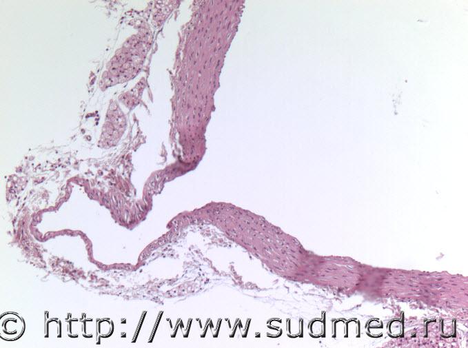 На препарате представлено очаговое истончение средней оболочки брюшной аорты (хомяка Ув.Н.И.! Если макроскопически увидели выпячивания, микроскопически нет сомнении, что аневризма. Иногда бывает тангенциальный срез, когда в области бифуркации(разветвления), при неправильной фиксации сосудов основания мозга в парафиновых блоках иногда срезы могут дать ложный рисунок.Думаю в Вашем случае при заливке в парафин сосуд расположился топографически правильно. |