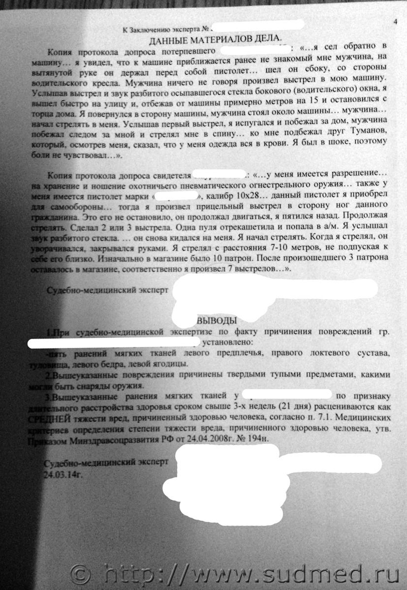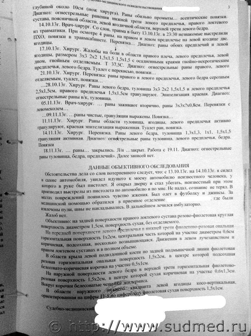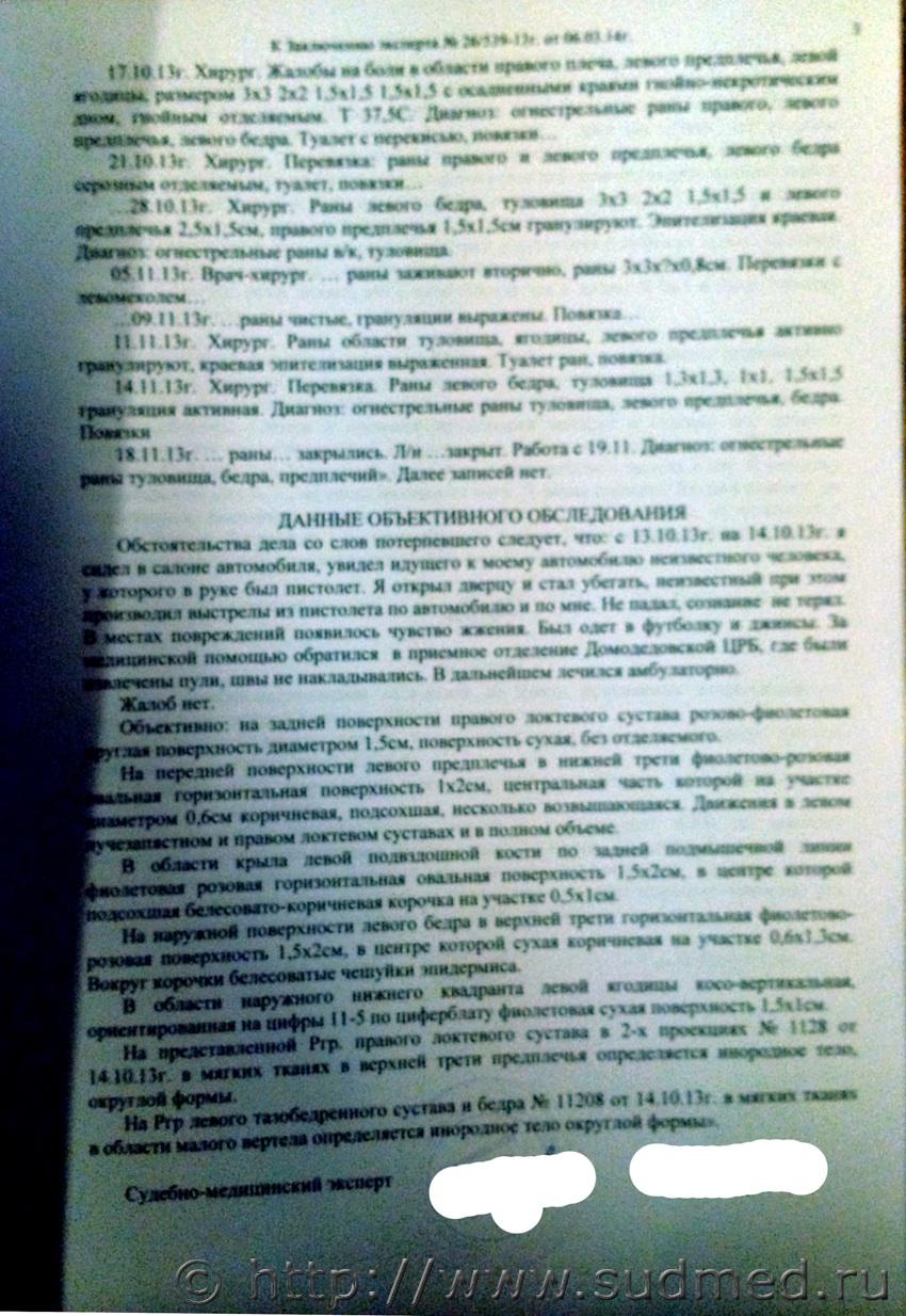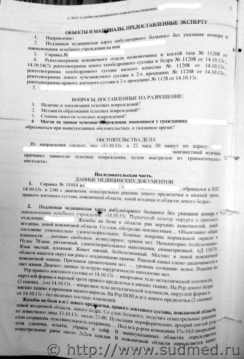 Уважаемые эксперты, ознакомился с заключением по доп.экспертизе с вопросом озвученным выше. К сожалению копии пока нет. заключение эксперта представляет из себя полностью перепизанное предыдущее заключение. В выводах описаны полученные повреждения и вывод, что исходя из локализации повреждений в момент произведения выстрелов потерпевший был повернут задним левым боком к дульному срезу оружия... Никаких методик исследования не указано. На исследование эксперту предоставлялся только акт мед. освидетельствования... Прошу Ваших комментариев.