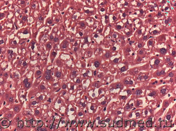 После 14 дневного введения препарата, способствующего усиленному расщеплению гликогена в печени, при микроскопическом анализе наблюдаются изменения со стороны гепатоцитов. Эти изменения носят обменный характер и проявляются в виде дистрофических изменений. Мне не ясно какой именно тип дистрофических изменений в данной ситуации имеет место. С моей точки зрения, это не баллонная дистрофия, хотя внешне похожа.