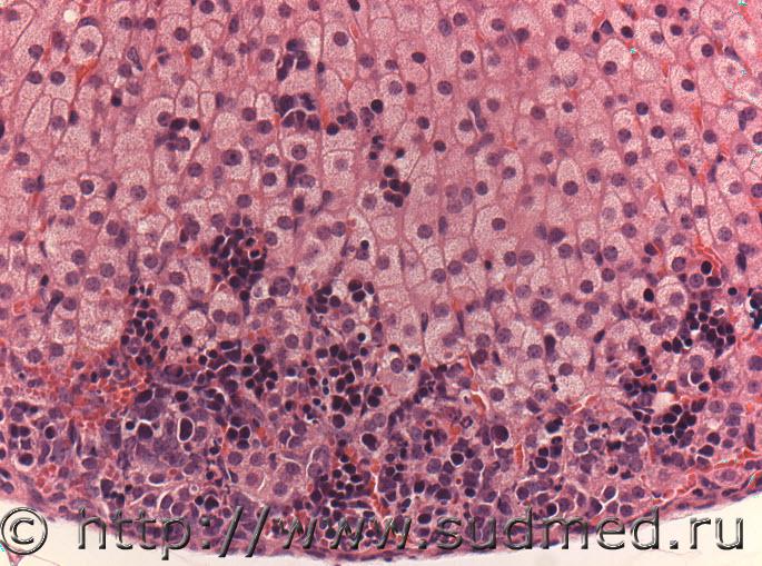 среднеочаговая инфильтрация клубочковой зоны с инвазией в пучковую зону базофильными клетками с морфологическими признаками незрелых форм клеток миелоидного ряда в одном из надпочечников; среди базофильных клеток встречаются единичные фигуры митоза, единичные двуядерные базофильные клетки и единичные сегментоядерные нейтрофилы; в области инфильтрации умеренно ↑ кровенаполнение микроциркуляторного русла Ув.Н.И.! В клубочковой зоне очаги инфильтрации представлены с гиперхромными полиморфными нетипичными ядрами с умеренной митотитической активностью и с единичными в данном поле зрения виден патологический митоз в ядрах. Ядерно-цитоплазматическое соотношение в сторону ядра. Мое предварительное мнение развивается атипизм, как Вы сами уже предсказали. Если внимательно посмотреть увеличение ядер наблюдается и в клетках пучковой зоны. |