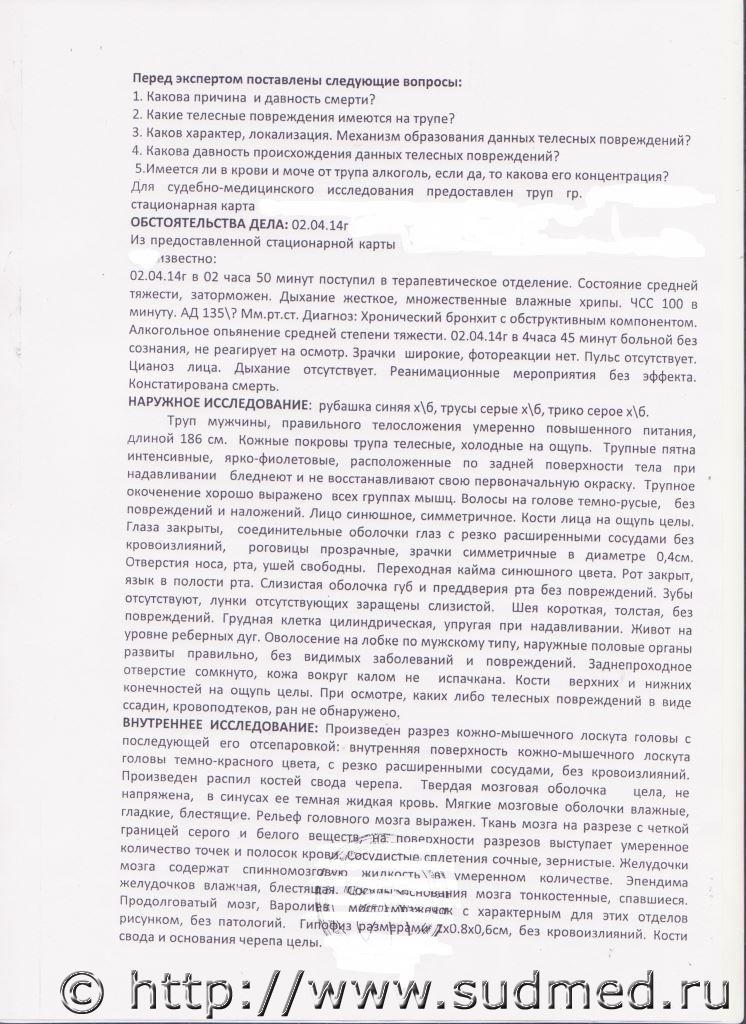 Цитата Можно по копии судмедэкспертизы, которую нам предоставили, удостовериться точную причину смерти человека? Возможно. Надо посмотреть. Цитата Копии я прикрепила. Где? Попробуйте еще раз. Разумеется, с соблюдением п.7.3.1 Правил Форума судебных медиков. |