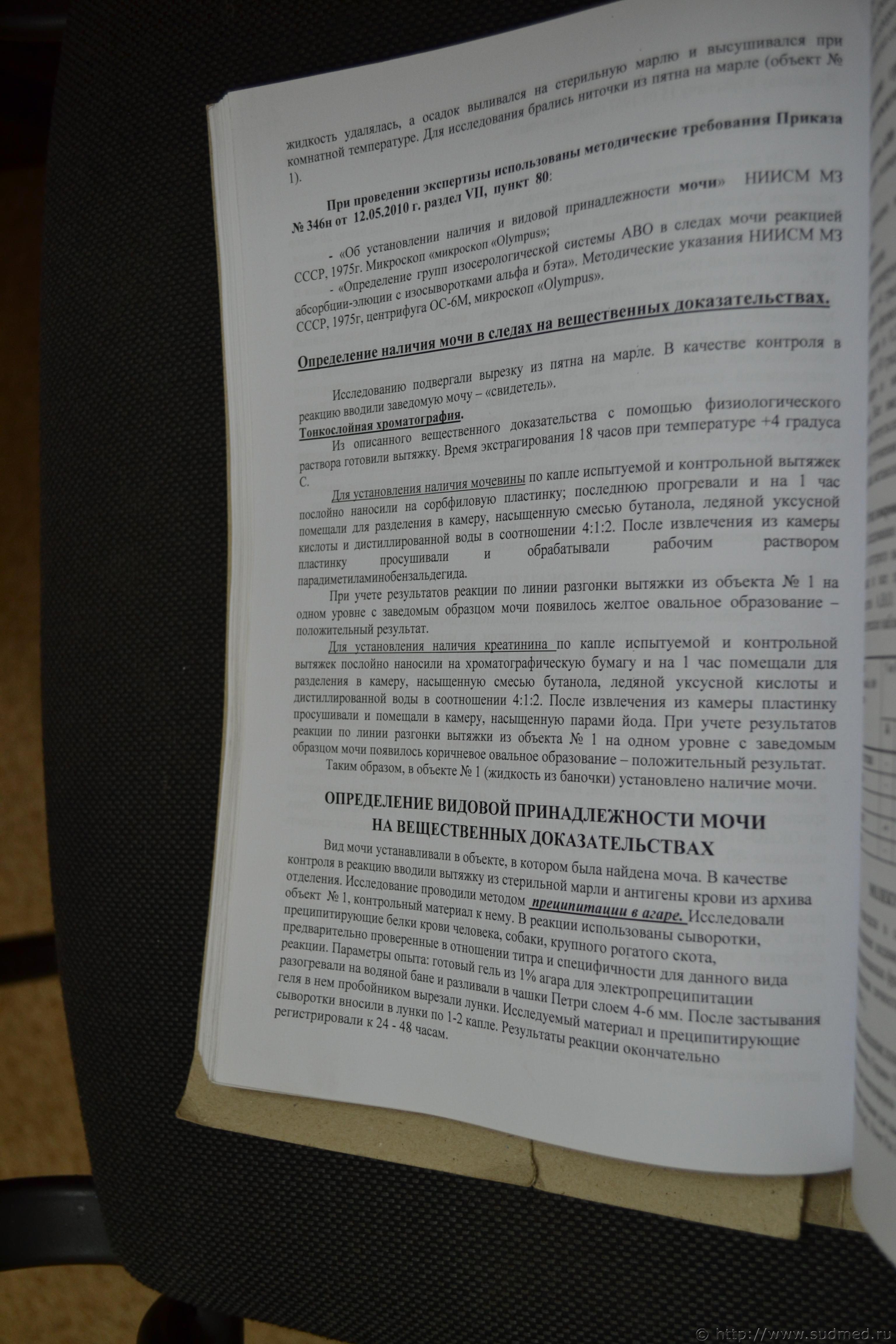 Доброго времени суток! Нарушений не вижу, исследование проведено грамотно. Есть, правда, бесполезное установление групповой принадлежности по системе АВО, но это общая беда всей Российской экспертизы: отчаянное стремление судебной серологии доказать свою нужность, вопреки смыслу. К генетической части вопросов не возникает. Не понял даже вашей реплики на счёт маркировки. Удачи. Если уж на то пошло, вместо абсолютно ненужного перевода денег на АВО-типирование, закупили бы нормальные тесты для идентификации биол. жидкостей. Дело в том, что использованный экспертом (и очевидно официально рекомендованый) метод детекции мочевины дает кросс-реакцию с другими жидкостями (кровь, слюна, пот, вагинальный секрет). Проведенный тест на креатинин тоже не количественный, строго говоря, он тоже мало что доказывает. В данном случае, очевидно сомнений в том, что это именно моча вроде быть не должно, но тем не менее, раз уж взялись... Сущестует куда лучшая альтернатива - иммунологический стрип-тест RSID-Urine, который реагирует на белок, специфичный именно для мочи. При высокой чувствительности он дает куда меньше ложно-положительных результатов. ЗЫ: ТС, фамилии-то из официальных документов надо бы убирать... |