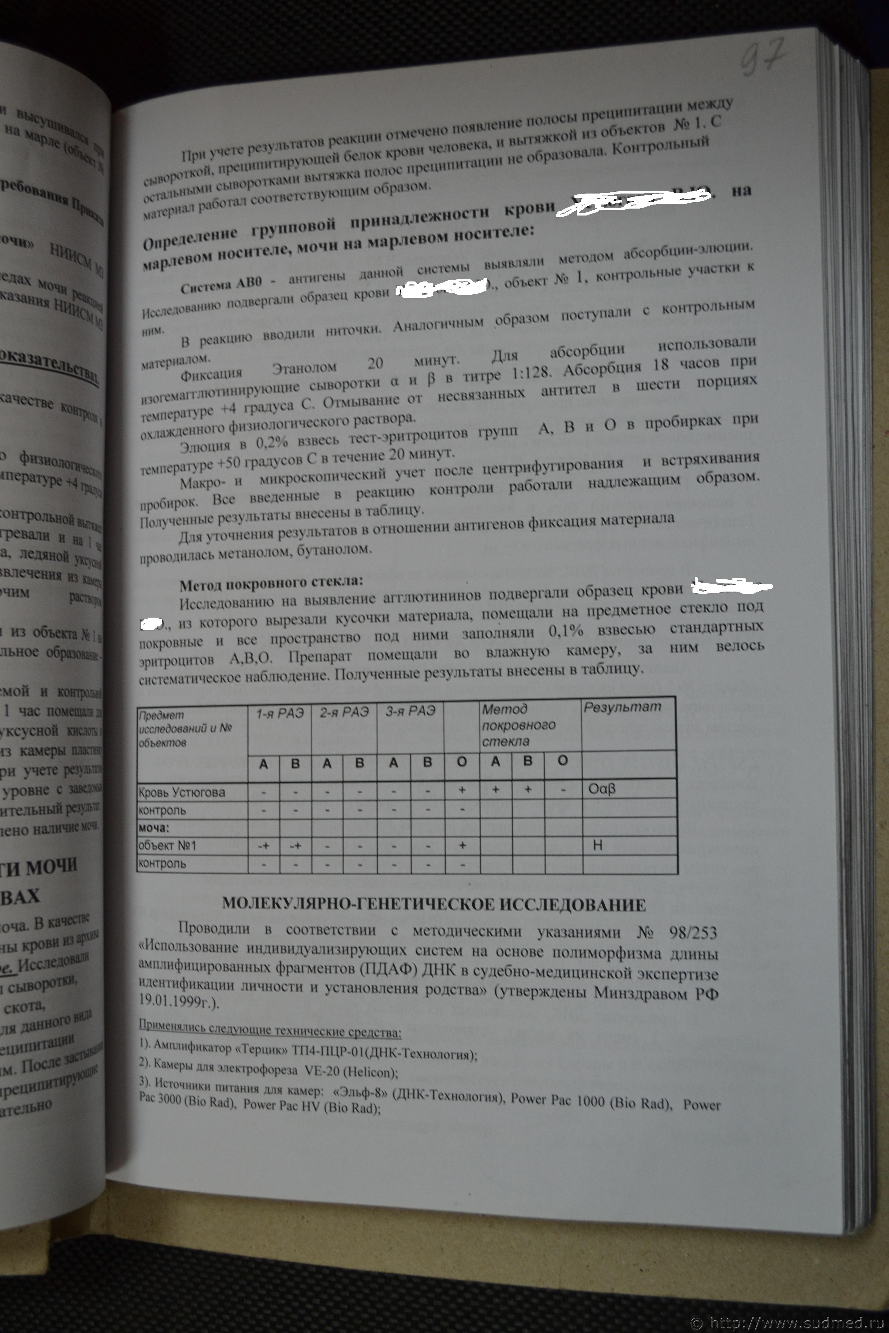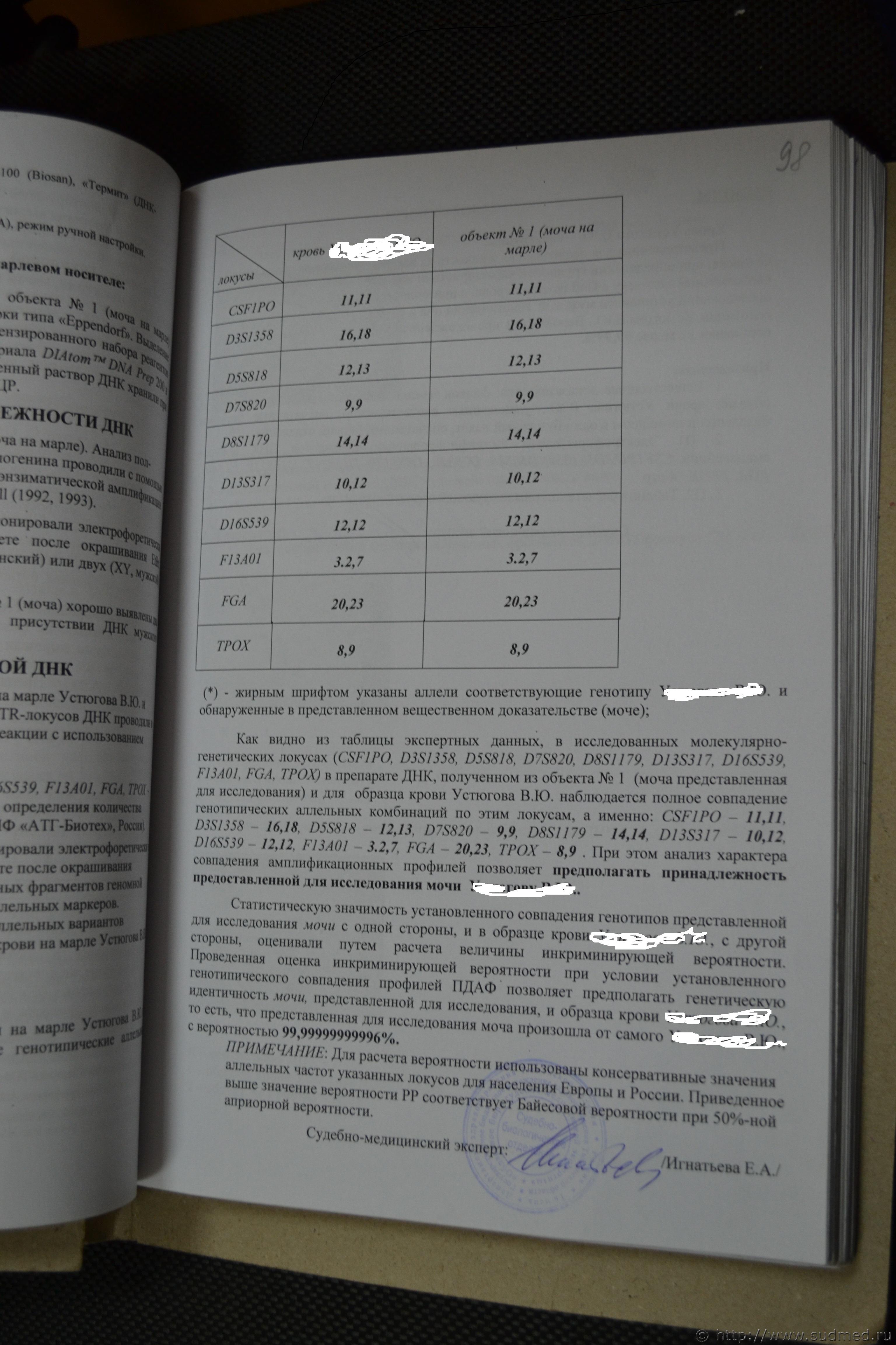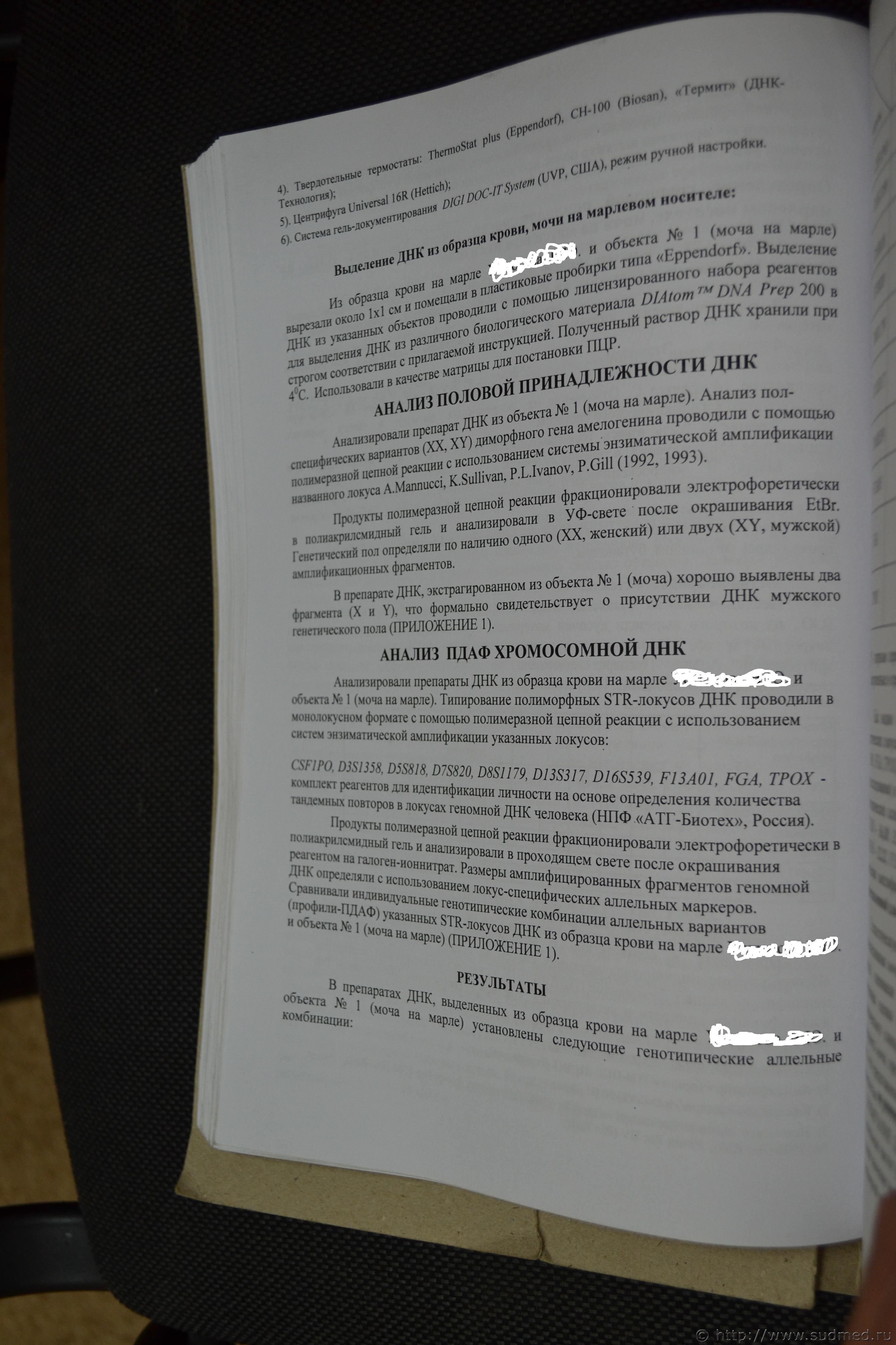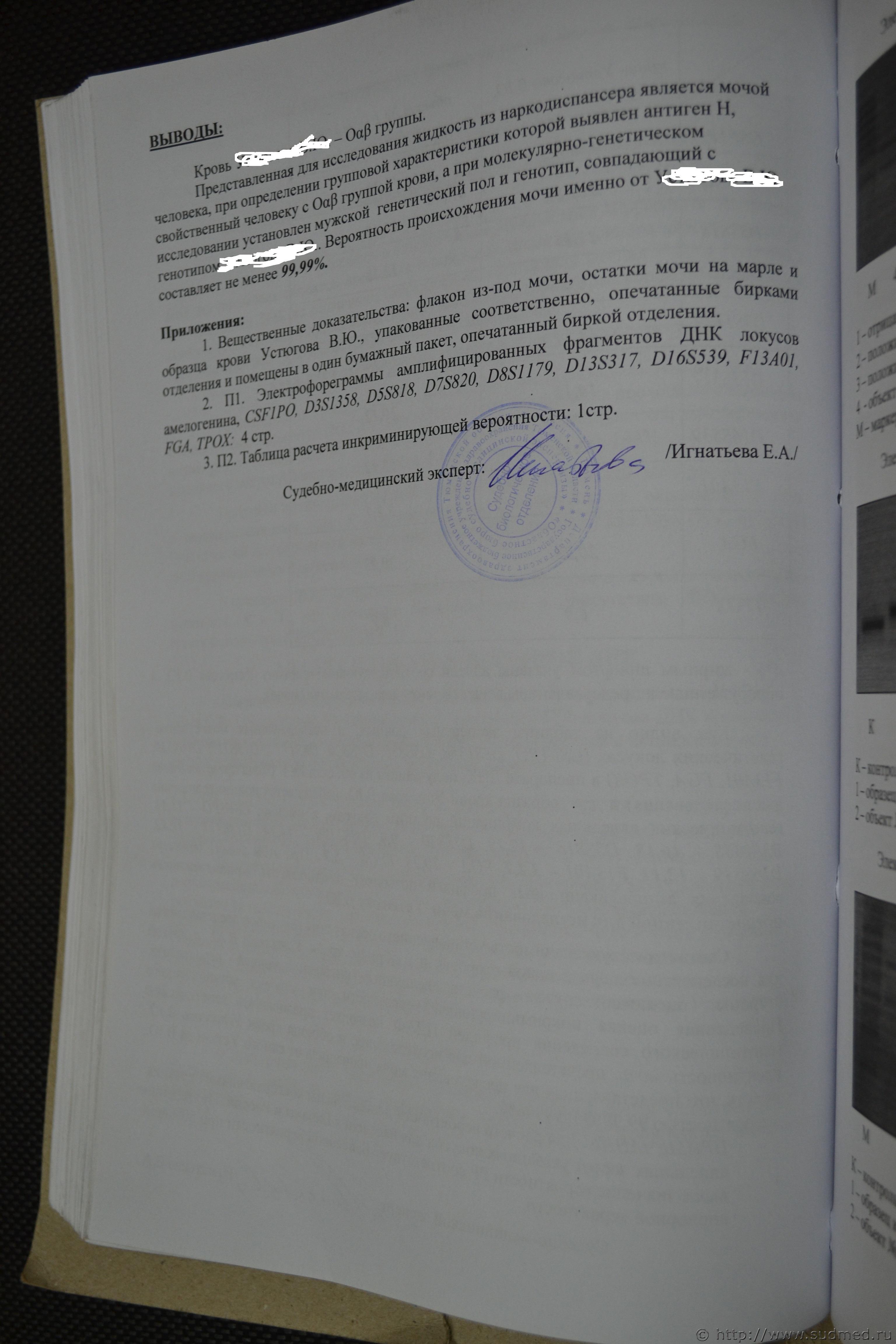 Да неважно это Вам. Мои замечания относились к методам идентификации мочи и крови, но в данном случае образцы были взяты из известных источников, особого смысла эта работа не имела. По анализу ДНК замечаний нет. ну источник мочи так то не понятен - написано же предположительно буква Е после цифр, а поступало под буквой А на нарк. исследование. получаются совершенно разные контейнеры. кровь известный источник палец подозреваемого моча может и этого же человека - но по маркировке контейнеров получается наркотик был в моче другого человека. Так что не понял идентификация что это и какую роль играет? Это проф. термин? Простое слово идентификация как то нее суразно тут. |