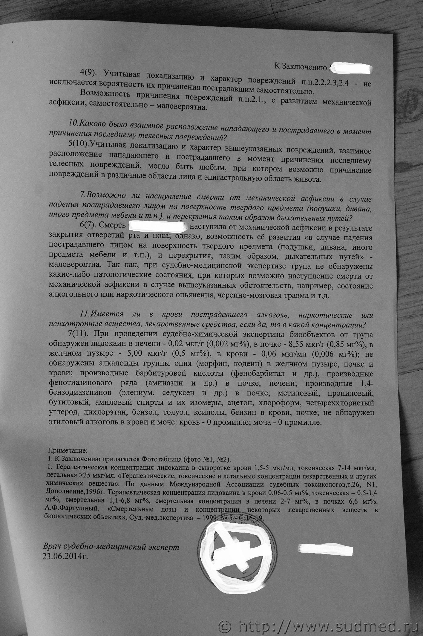 "ОСН ушибленные раны и кровоизлияния на слизистой верхней губы в проекции 2-х зубов,кровоизлияние в месте перехода слизистой верхней губы на десну по средней линии, два кровоизлияния на слизистой нижний губы в проекции 2-3х зубов слева и справа, кровоизлияния в мягкие ткани области носа и рта, кровоизлияние в мышцы кончика языка, множественные внутрикожные кровоизлияния на лице, на передней поверхности шеи в верхней и средней трети, множественные крупноточечные кровоизлияния на слизистой верхней и нижней губы, левой и правой щеки, точечные кровоизлияния в соеденительных оболочках век, выраженный отек легких(отпечатки ребер на задней поверхности легких) мелкоточечные темно красные кровоизлияния под легочной плеврой и эпикардом (пятна Тардье), выраженное венозное полнокровие внутренних органов, темная жидкость кровь в полостях сердца и магистральных сосудах, хорошо выраженные синюшно-фиолетовые трупные пятна с множественными мелкоточечными темно-красными кровоизлияниями. СОП Колотое-резаное приникающие слепое ранение живота без повреждения внутренних органов и крупных кровеносных сосудов, гемоперитонеум (50мл). Кровоподтеки в области правого и левого глаза , кровоподтек в области носа, многооскольчатый перелом носовых костей. Три ушибленные раны лобной области. След от иньекции в правой локтевой ямке.Атеросклероз аорты...>>." Вскрытие проводилось через день после обнаружения тела, эксперт ставит время смерти около 1,5-4 дней относительно момента вскрытия. На компьютере моего брата есть история просмотров в браузере опера где последняя ссылка открывается в ночь в 4 13, что не соответствует заключению эксперта на 4 часа, смотрел он на протяжении 3 дней различные способы ухода из жизни, очень много ссылок про ледокаин укол смерти, дозы и т.п. При этом оперативниками осматривавшими место и положение тела, не было сделано фотографий и зафиксировано положение тела(это было сделано после мед экспертизы с маникеном) . Мой брат лежал лицом в пол, перпендикулярно носом относительно пола щеки были в крови, была лужа с кровью возле головы, ноги были вмести скрючены одна на другую, кончики пальцев ног упирались в пол так же перпендикулярно, как будто он уснул. На момент когда я его нашел он был окалевший, затвердевший. В выводах эксперт не исключает принесение всех телесных повреждений самостоятельно, кроме ран на губе, которые как я думаю могли у него образоваться от того что он лежал лицом в пол упираясь этими самыми губами в линолеум на протяжении 12 часов до момента обнаружения. Точнее у меня просьба к вам, могли ли образоваться эти ранки на губах именно от этого, ведь тогда причина смерти не механическая асфиксия от перекрытия дыхательных путей. Кроме того была проведена судебно химическая экспертиза биообьектов: Обнаружен лидокаин в печени -0.02 мкг/г(0.002 мг%), в почках 8,55 мкг/г(0,85%мг), в желчном пузыре 5.00 мкг/г(0.5%мг) в крови 0.06 мкг/мл (0.006%мг). производные 1.4 бензодиазепинов (элениум, судуксен и др.) При этом эксперт пишет что патологии нету. Я много читал про лидокаин и про период полувыведения, про дозы, реакции, судороги, аллергию, передозировку. Но это всего лишь поверхностный взгляд обывателя. По этому и пишу здесь вам, прошу помочь мне разобраться, это очень важно для меня, так как я находился в статусе свидетеля на протяжении 3 месяцев, сей