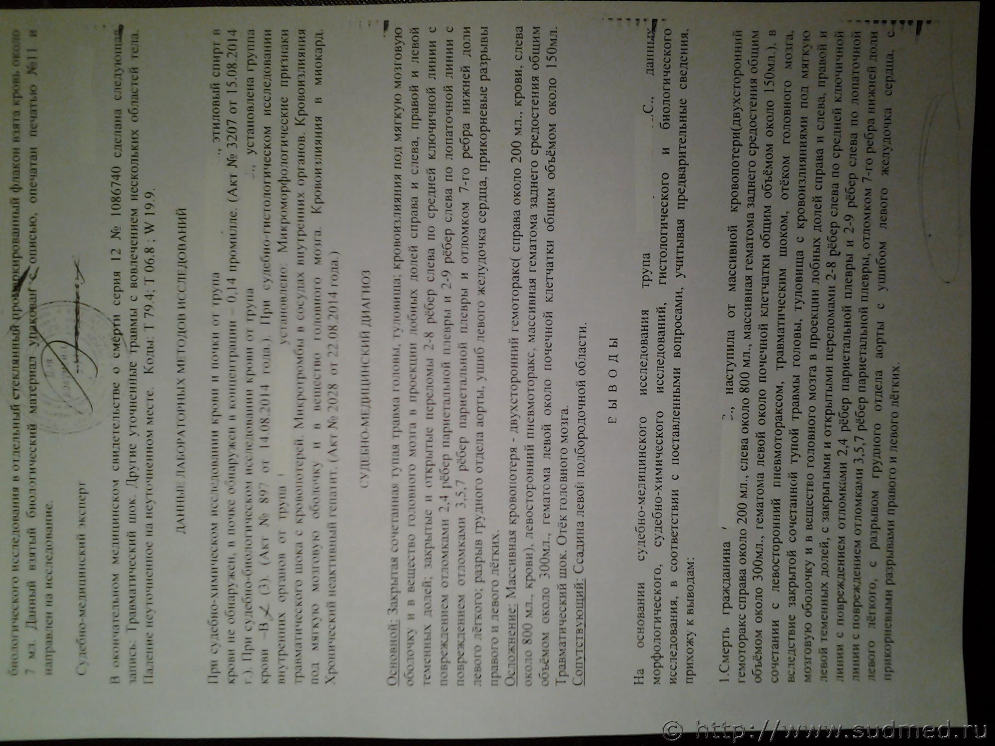А вас как смэ ничего в заключении не настораживает? Ну например при разрыве аорты гематома всего на 300мл? Общий объем кровопотери составил 1500мл. А в заключениии причина смерти именно кровопотеря и шок. никто мне так и не ответил по поводу этилового спирта0,14 промилле в биоптате почки(откуда берется, или организм как то сам вырабатывает алкоголь? Сакажу сразу муж алкоголь не употреблял вообще ) В сельской больнице капали глюкозу и докапались до сахар в крови 16, соответственно шарахнули инсулин. Через несколько минут рухнуло давление в пол и все вены спались , больше ничего не удалось поставить. (Суммарно перелили 1500мл) но по заключению эксперта мочевой пузырь спавшийся, а куда моча то делась(сам не писал и катетор не ставили) И еще много вопросов накопилось...... Спасибо господа эксперты заранее |
