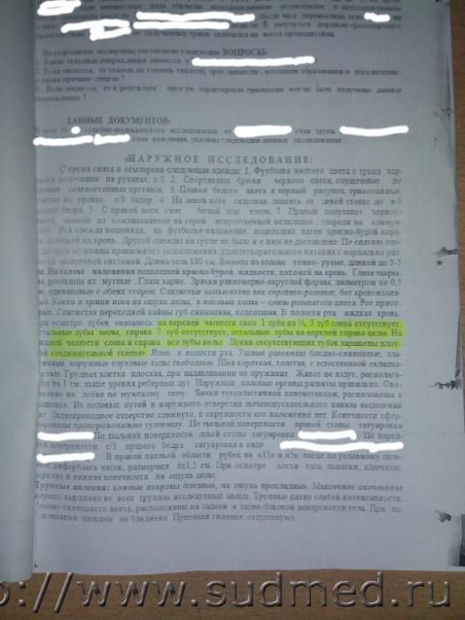 Не могу прочитать описание одежды и гипсовой лонгеты.Описаны ли повреждения одежды,лонгеты ? Про обувь что-либо есть ? На лангете имеется следы лакокрасочного покрытия в области колена в форме треугольника размером примерно 15*20*25 см. на вид как косательное соприкосновение с поверхностью окрашенного предмета, сама лангета не повреждена. на штанах разрывы швов, куртка пропала, обувь не исследовалась или это скрыли. По данному труп осудили моего брата по ст.111 ч.4 УК РФ к 10 годам, только за то что за двое суток до обнаружения трупа в том районе у брата произошла ссора с неизвестным ему человеком. фото трупа даже свидетелям не показали и не разрешили провести опознание, с этим ли вообще человеком у брата была ссора. Брат вину в этом не признал. В приговоре написали что он нанес потерпевшему 7 ударов руками и ногами в область туловища, чем и причинил эти травмы. фото лангеты с красителей выложу чуть позже, как возьму копии. |