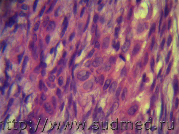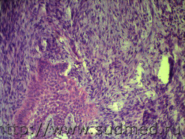 Н/О в ротовой полости в области десны По многослойным плосколеточным эпителиям слизистой имеет место базальноклеточная нарушение полярности( умеренные признаки дисплазии), а по подслизистой строме признаки если это действительно макроопухоль, то микроскопически веретеноклеточный(фиброзный) эпулис! |