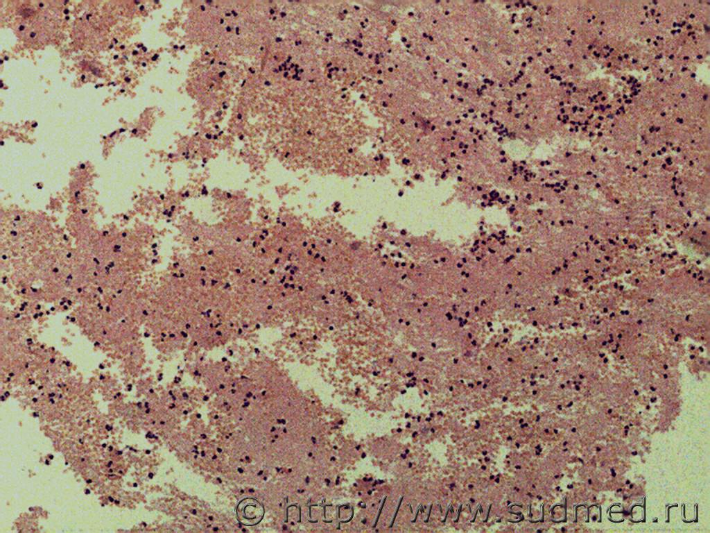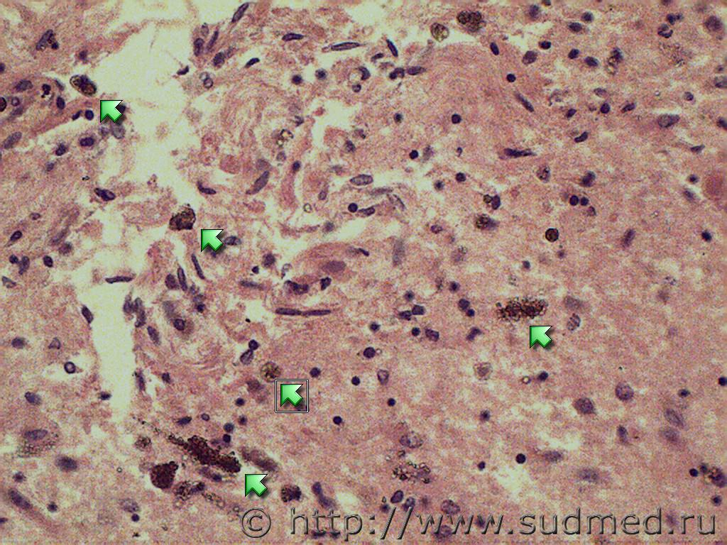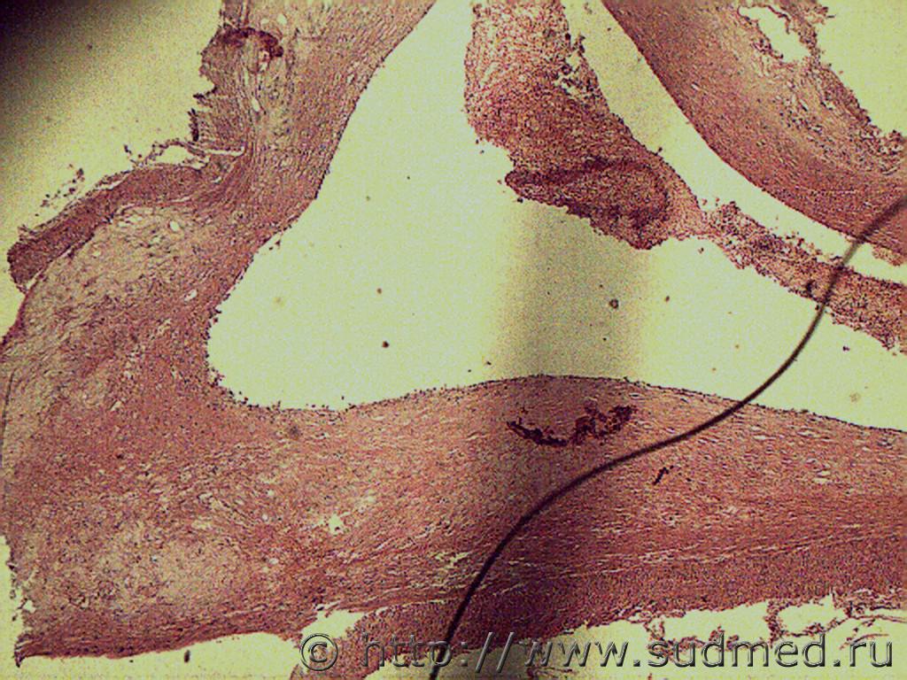 1.Каким образом доказано,что был "выпивши" ? 2.При таких цифрах АД у человека произошло внутрижелудочковое кровоизлияние с перифокальным размягчением и прорывом в крови в субарахноидальное пространство. 3.По причине этой "болячки" ,скорее всего,он и въехал в забор. В приёмнике доктор описывает запах алкоголя, да и родственники подтверждают. Возраст 60 лет. На микрофотографиях есть вена с разрывом в ММО основания лобной доли со странной стенкой (какие- то отложения гомогенных эозинофильных масс, неравномерное утолщение её) или я придираюсь? Могу ещё фотографии этой вены выложить поподробнее. Непонятные моменты в вене помечены стрелками. 1 и 4 фотографии.  |