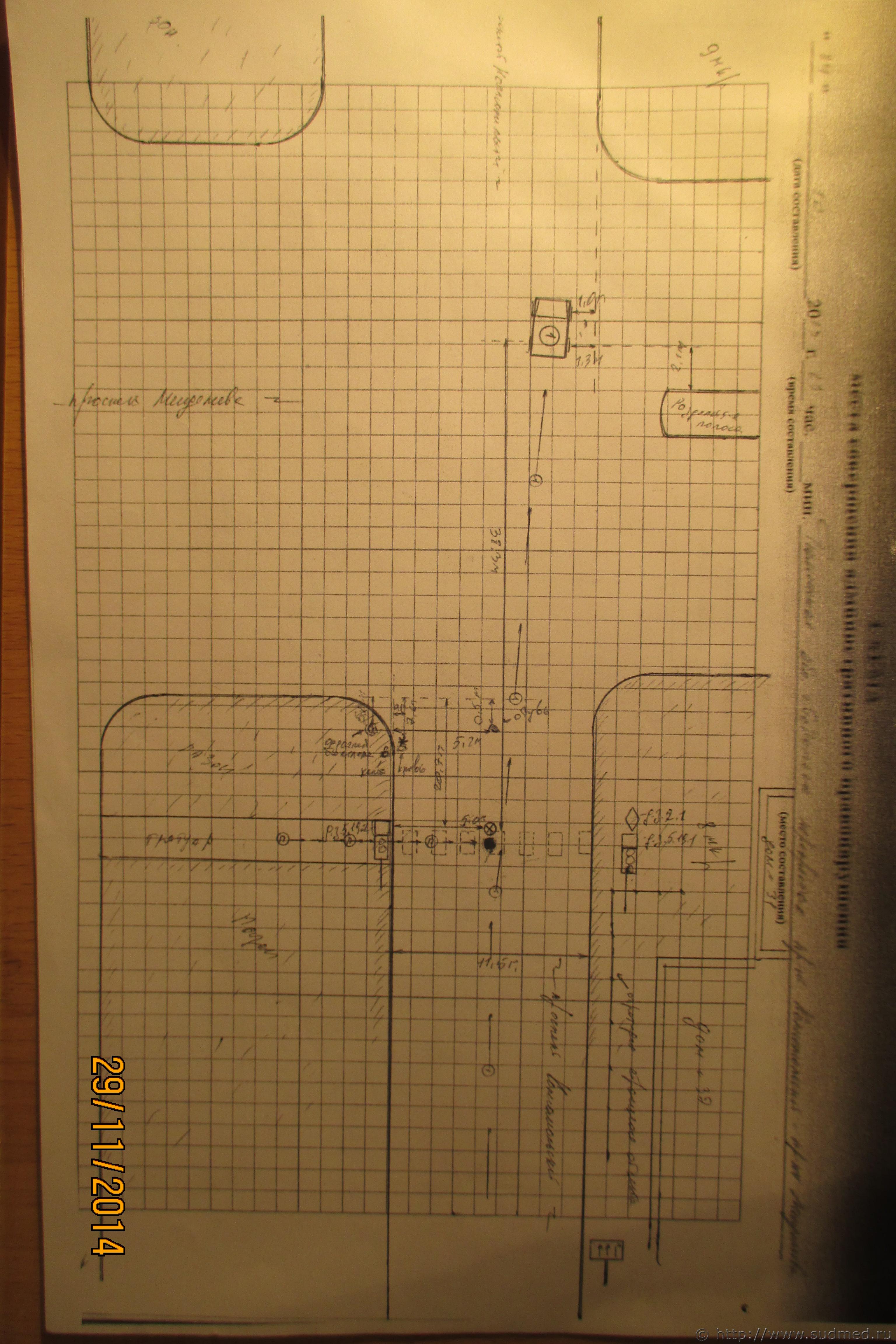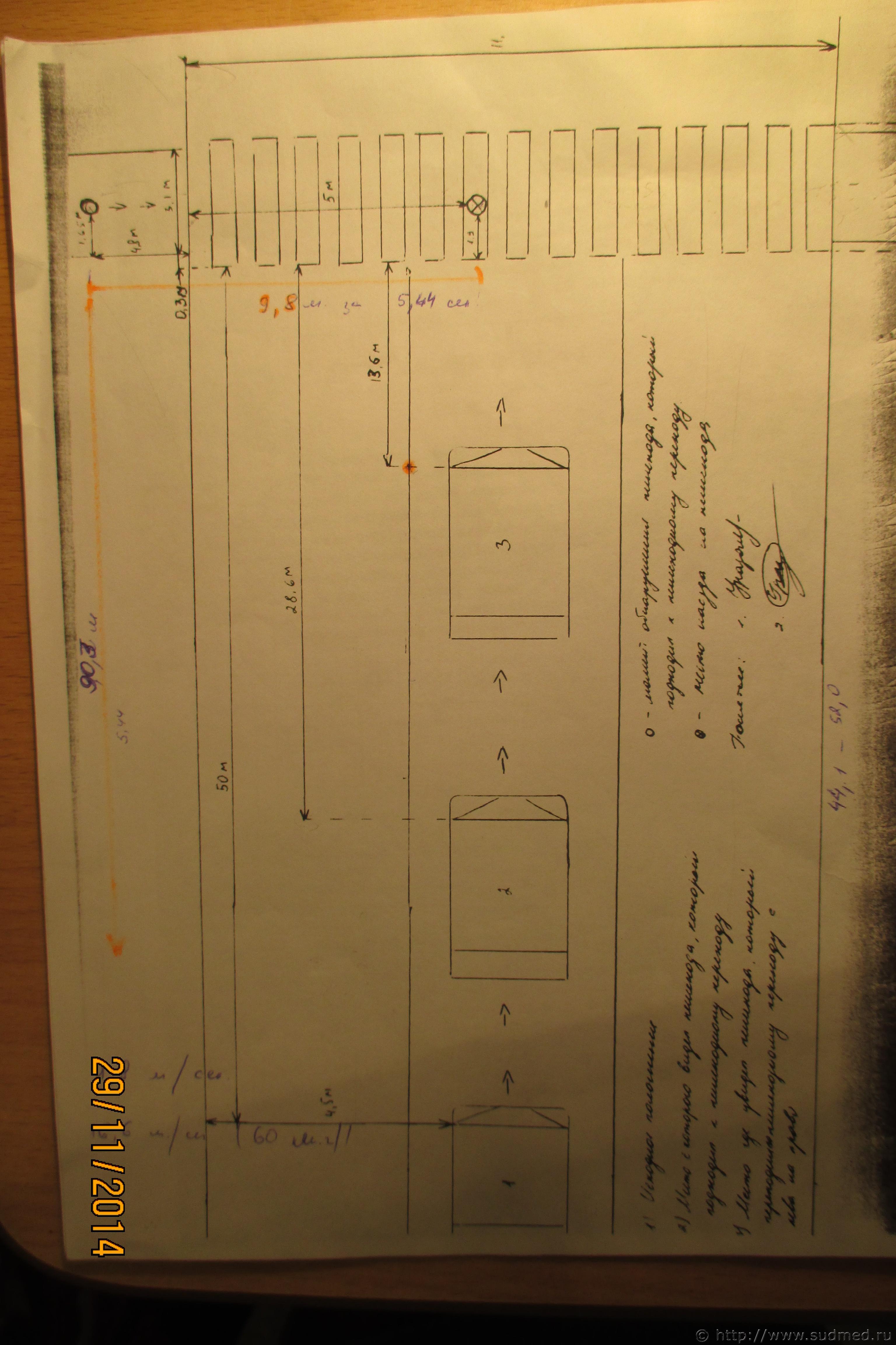 Этого не понял.Если в "Заключении эксперта" не описана одежда,значить труп доставлен в морг без одежды. Судмедэксперт, который делал вскрытие, занимает руководящую должность, он от личной встречи отказывался, ссылаясь на занятость, как отвечала его секретарь (игнорировал меня), потом сам позвонил мне на сотовый телефон и мы пообщались по телефону, сказал, что все показания дал следователю , и удар был спереди во внутреннюю часть левой голени. труп вообще поступил в четверг, экспертиза начата в пятницу утром, а закончена в понедельник, т.е почти 4 дня, все говорил, что тот был "вдрыбаган" пьян. Я вам скинула еще 2 схемы, как шел пешеход, посмотрите пожалуйста, я не могу понять почему мой свидетель утверждает, что он шел (не плелся при такой степени опьянения) со стороны светофора, справа налево, прошел крайнюю правую сторону, а автомобиль должен был поворачивать направо, но проехал прямо. Пешеходу был запрещающий сигнал светофора, но и водителю направо не горел зеленый. На крайней левой и средней полосе стояли машины. Техэспертиза показала, что тот не имел техвозможности предотвратить наезд, нет даже тормозного пути. Если я приду к судмедэксперту на личный прием, он мне обязан выдать журнал, или может мне отказать. Есть ли какие нибудь положения, в которых прописано, что делать с одеждой покойника, если он лежал там 5 дней. На кого мне написать жалобу на следователя или сотрудников морга. Этого не понял.Если в "Заключении эксперта" не описана одежда,значить труп доставлен в морг без одежды. Эскизы прикрепленных изображений |