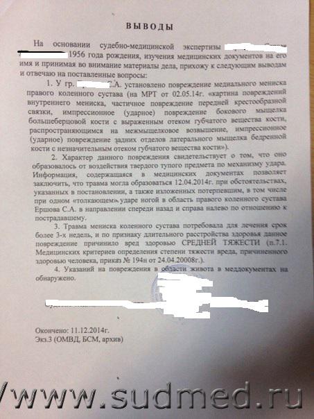 Ситуация банальная два соседа вступили в конфликт. Один(потерпевший) утверждает, что второй участник ударил его ногой в коленку. На что, его оппонент говорит о том, что он не бил по коленке, а потерпевший оступился, стал хромать и упал на него. У потерпевшего застарелый мениск, по этому поводу он лечился и стоял на очередь на операцию. Заключение эксперта было основано только на показаниях потерпевшего, показания второго участника в деле на тот момент не фигурировали.