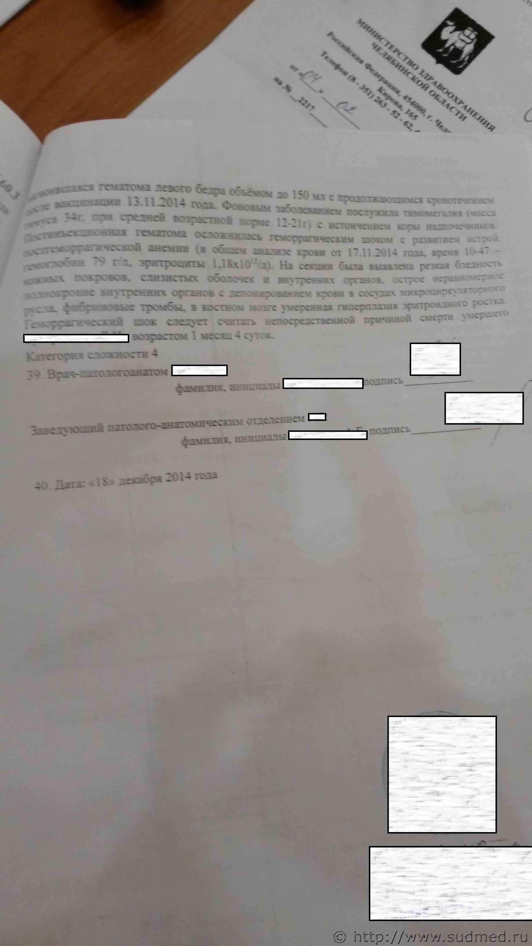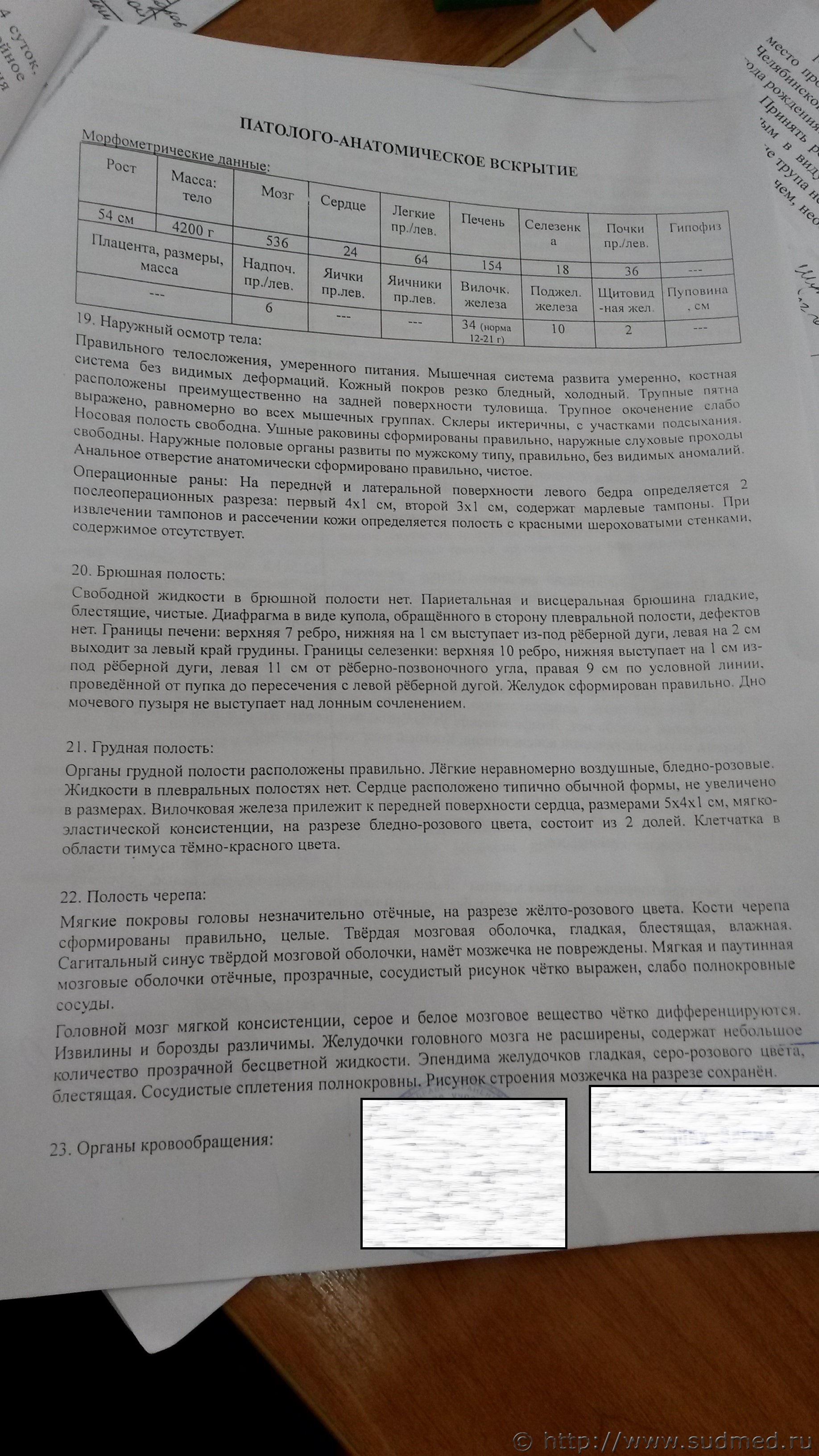 Уы.Юлия-92! Удалил приложенный Вами лист с текстом, т.к. его содержание противоречит п.7.3.1 Правил Форума судебных медиков. Приведите в соответствие. И опубликуйте вновь. Уы.Юлия-92! Удалил приложенный Вами лист с текстом, т.к. его содержание противоречит п.7.3.1 Правил Форума судебных медиков. Приведите в соответствие. И опубликуйте вновь. Уы.Юлия-92! Удалил приложенный Вами лист с текстом, т.к. его содержание противоречит п.7.3.1 Правил Форума судебных медиков. Приведите в соответствие. И опубликуйте вновь. я у следователя взяла полный протокол вскрытия, расшифруйте мне пожалуйста пункты 36,38 мы накидали с ним вопросы для смэ, посоветуйте что следует добавить а что нужно убрать вопросы: 1.какое заболевание(повреждение) имелось у больного? 2.правильно ли и своевременно ли был поставлен диагноз? 3.если диагноз был поставлен неверно или несвоевременно, то была ли возможность поставить правильный диагноз? 4.если диагноз поставлен неправильно или несвоевременно,то какие последствия это вызвало? 5.имелась ли объективная возможность постановки правильного диагноза 6.насколько полно было произведено обследование больного 7.правильно ли проводилось лечение 8.если лечение проводилось неправильно, то к каким последствиям это привело 9.какова причина смерти 10.имелась ли возможность предотвратить смертельный исход была ли необходимость проведения операции и правильно ли технически она была проведена 11.если операция была проведена не правильно,то к каким последствиям это привело 12.имелась ли прямая причинная связь между ошибками,допущенными в лечении,и наступлении смерти 13.что было основной причиной наступления смерти:тяжесть заболевания или повреждения и ошибки,допущенные в диагностике или лечении 14.имелась ли необходимость в проведении неотложной операции в отделении хирургии ГБ №1(а не в отделении детской хирургии), и в чем была выражена неотложность 15.имеются ли дефекты в оказании медицинской помощи на всех трех этапах лечения(вакцинация,операция,реанимация) 16.в должном ли объеме оказана медицинская помощь на всех трех этапах лечения?если нет,то в какой именно части помощь была оказана не в полном объеме? 17.имеется ли причинно-следственная связь между дефектами оказания медицинской помощи на всех трех этапах лечения и смертью? Эскизы прикрепленных изображений |