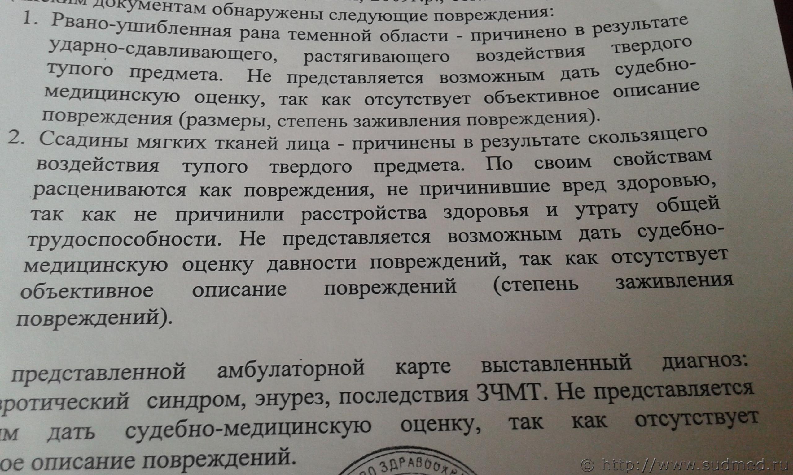 Здравствуйте мой ребенок в результате дтп разбита фара у автобуса ребок разбил голову на затылке наложено 2 шва рвано ушибленая рана теменной области, ссадины мягких тканей лица.на момент осмотра данных на острую поталогию чмт нет.через неделю были у окулиста здорова.еще через неделю поставили ангиопатию сетчатки.сделали м-эхо появилось внутречерепное давление и жидкость в 3-м желудочке, головные боли в весочной области.диагноз невролога..астеноневротический синдром, энурез, последствие ЗЧМТ.И итог пишут что телесные повреждения расцениваются как не приченившие вред здоровью.на лечение и обследование у нас ушло 6 мес.подскажите правильно ли это?