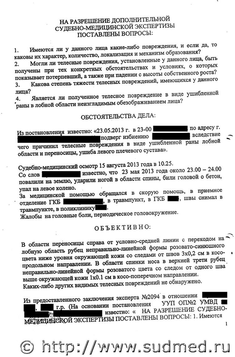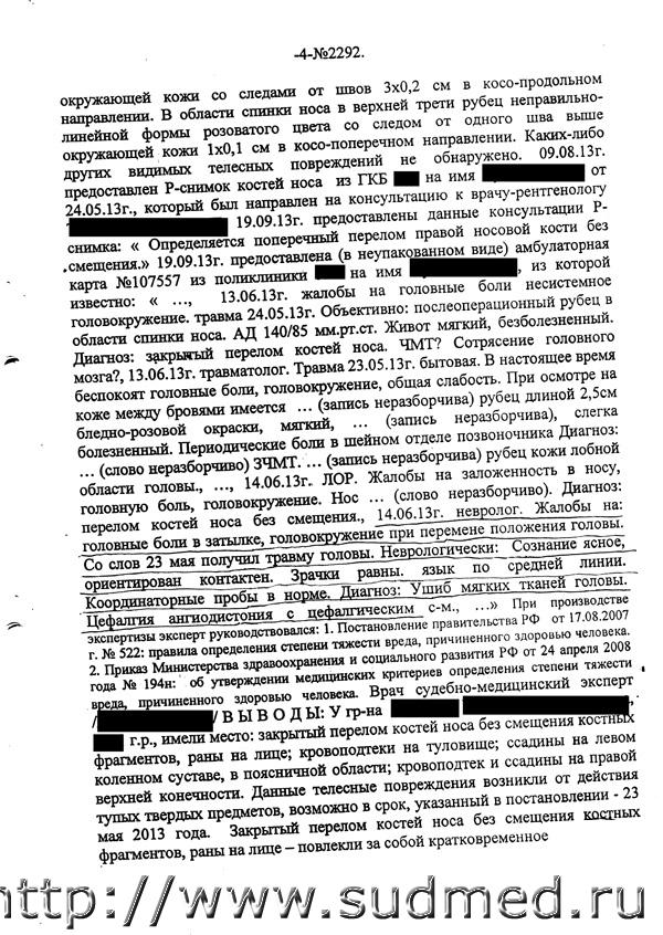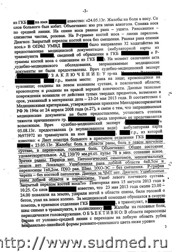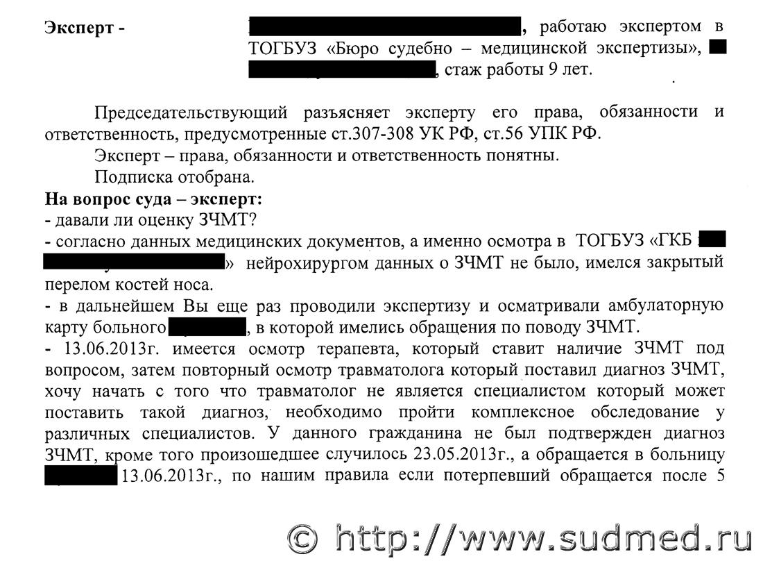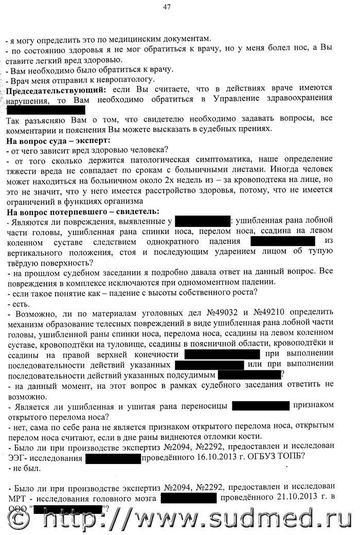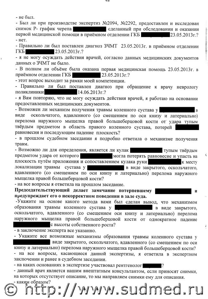 Вред здоровью определен верно, данных за ЧМТ не отражено. В допросе эксперта на стр. 48 появляется перелом мыщелка большеберцовой кости. В экспертизе этого нет.