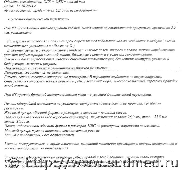 Заключение СТК от 16.10.14.: Множественные переломы ребер, правой и левой лопатки, перелом левой ключицы, КТ картина ушиба легких, двухсторонний малый гидропнпневмоторакс ( без компрессии легких). В органах брюшной полости и малого таза- без видимой патологии.