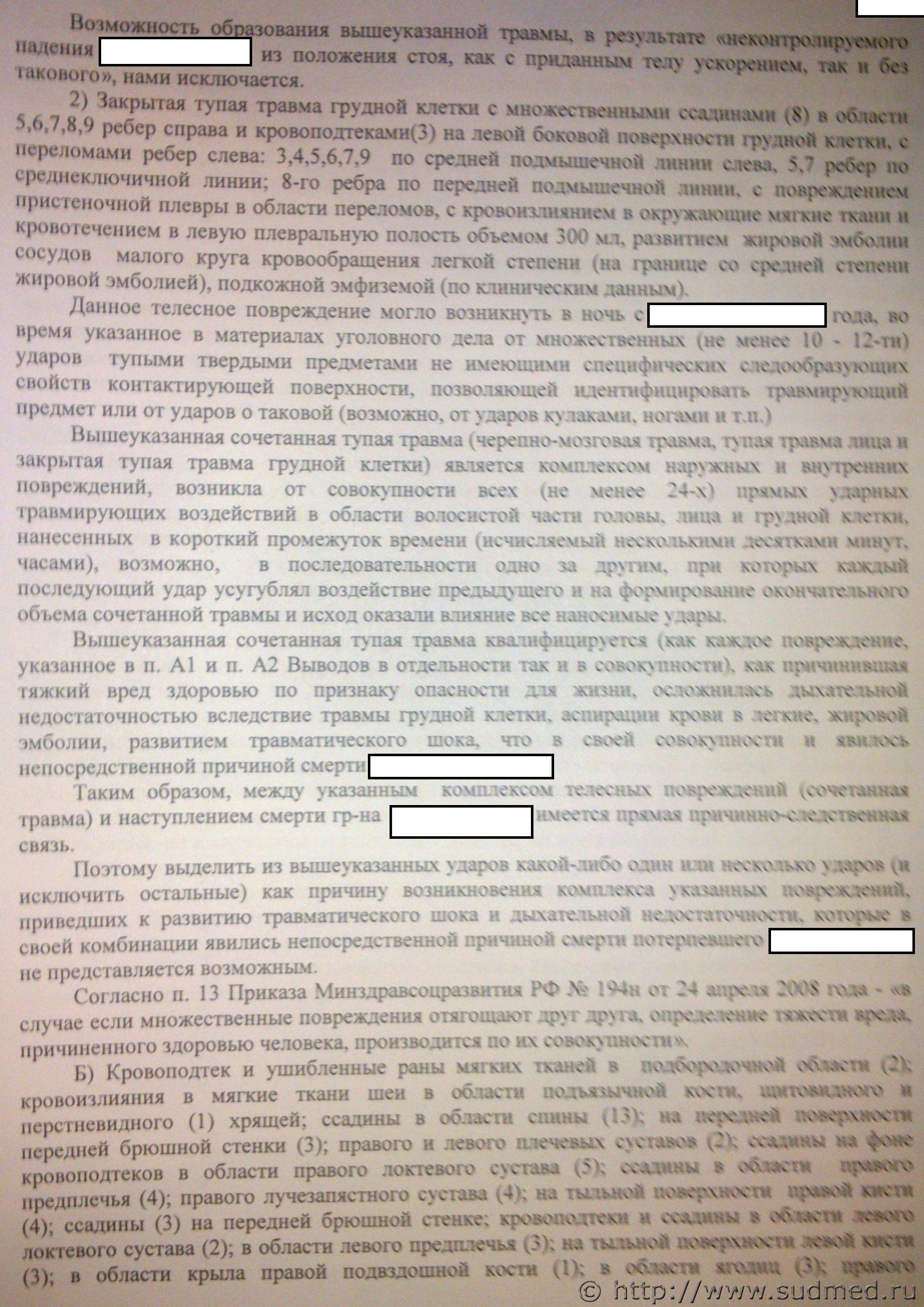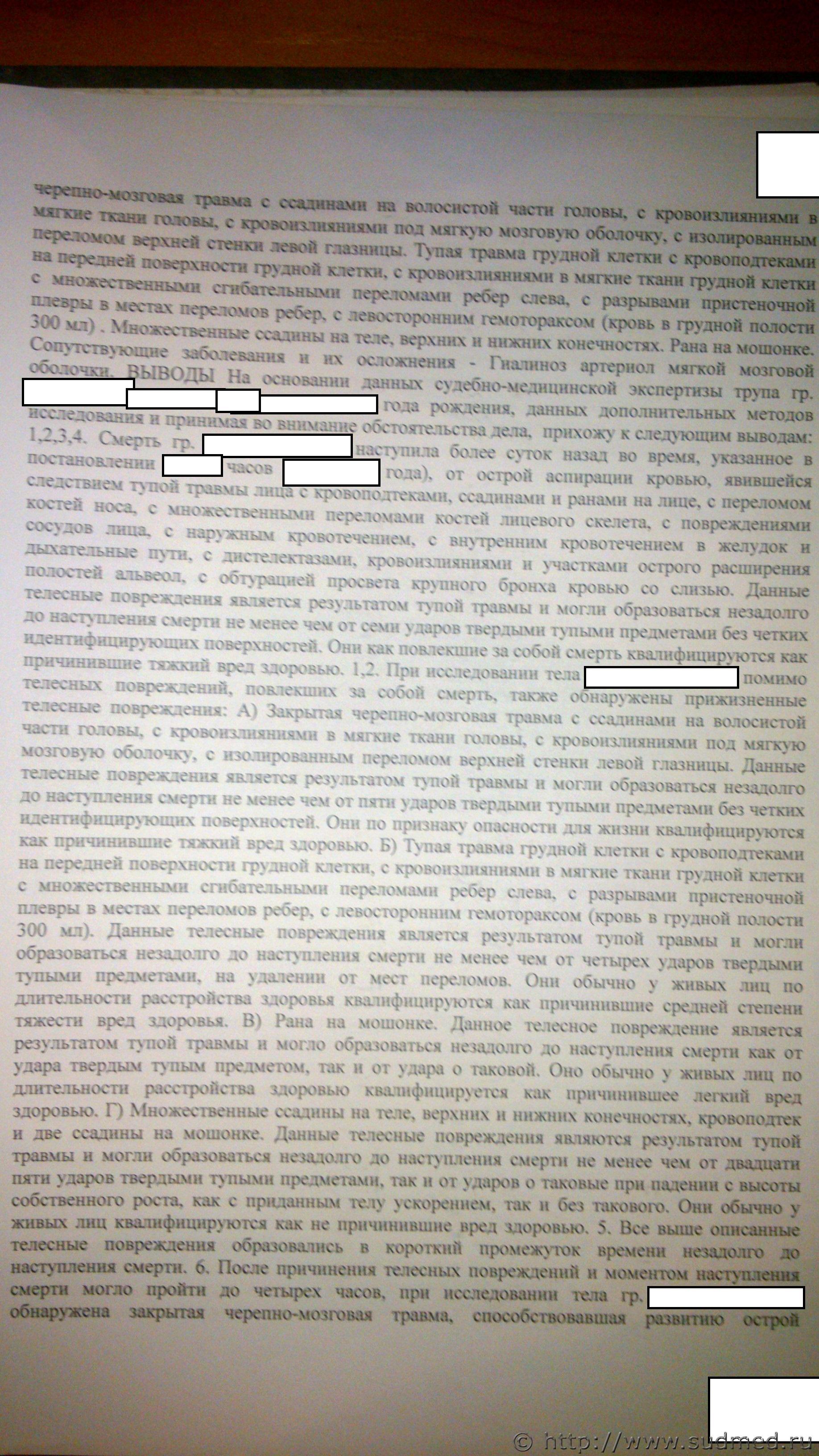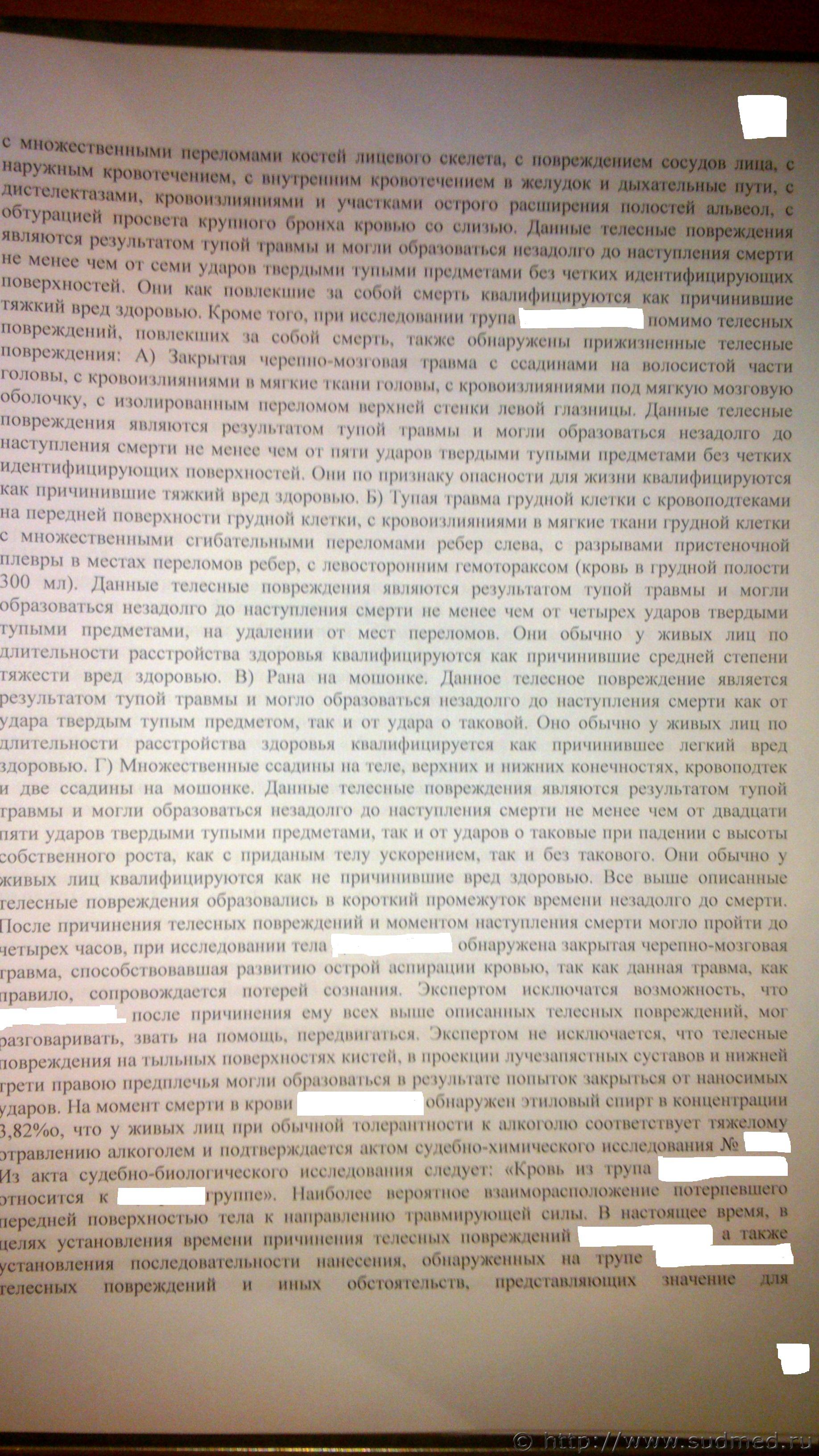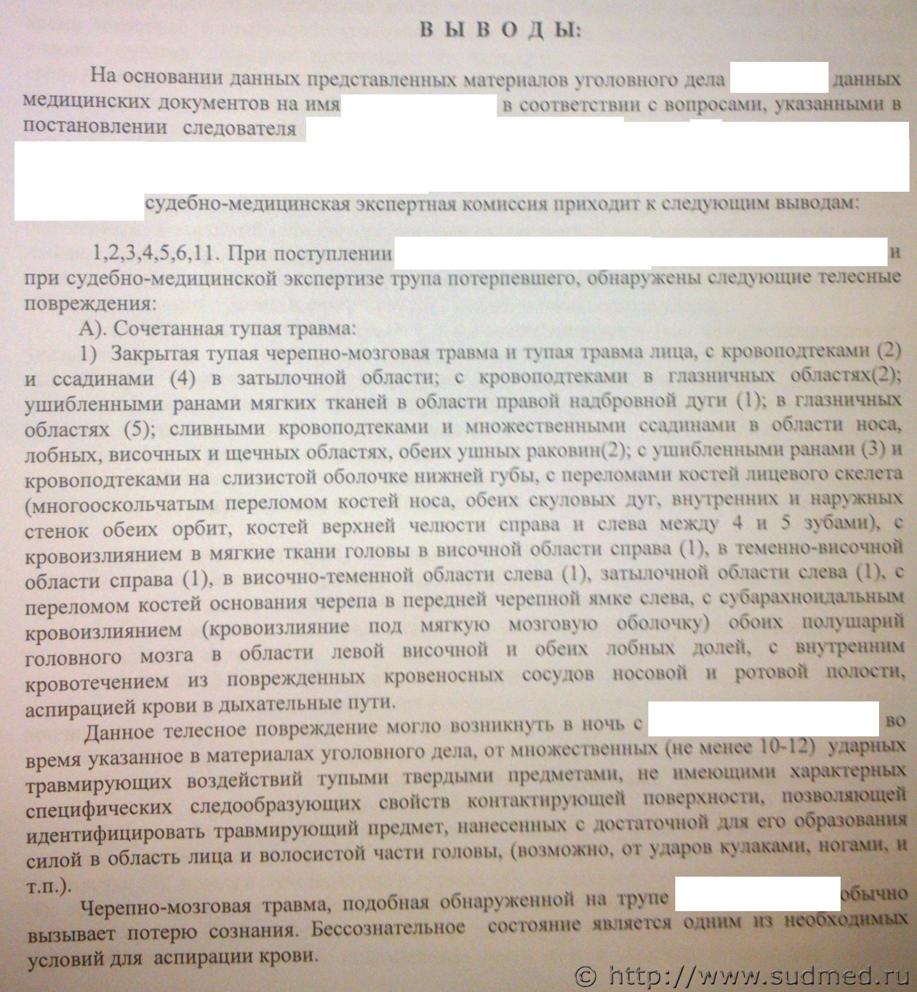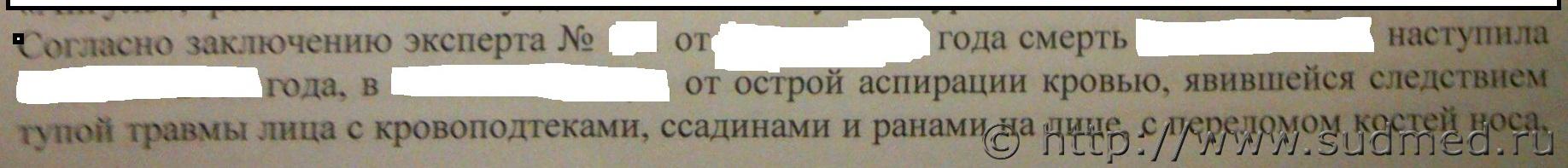 Здравствуйте помогите разобраться с вопросом, из заключения эксперта проводившего вскрытие следует что смерть наступила от острой аспирации кровью, явившейся следствием тупой травмы лица с кровоподтеками, с садинами и ранами на лице, с переломом костей носа, с множественными переломами костей лицевого скелета, с повреждениями сосудов лица, с наружным кровотечением, с внутренним кровотечением в желудок и дыхательные пути, с дистелектазами, кровоизлияниями и участками острого расширения полостей альвеол, с обтурацией просвета крупного бронха кровью со слизью, данные телесные повреждения являются результатом тупой травмы лица и могли образоваться не задолго до наступления смерти не менее чем от семи ударов твердыми тупыми предметами, они как повлекшие за собою смерь квалифицируются как причинившие тяжкий вред здоровью.