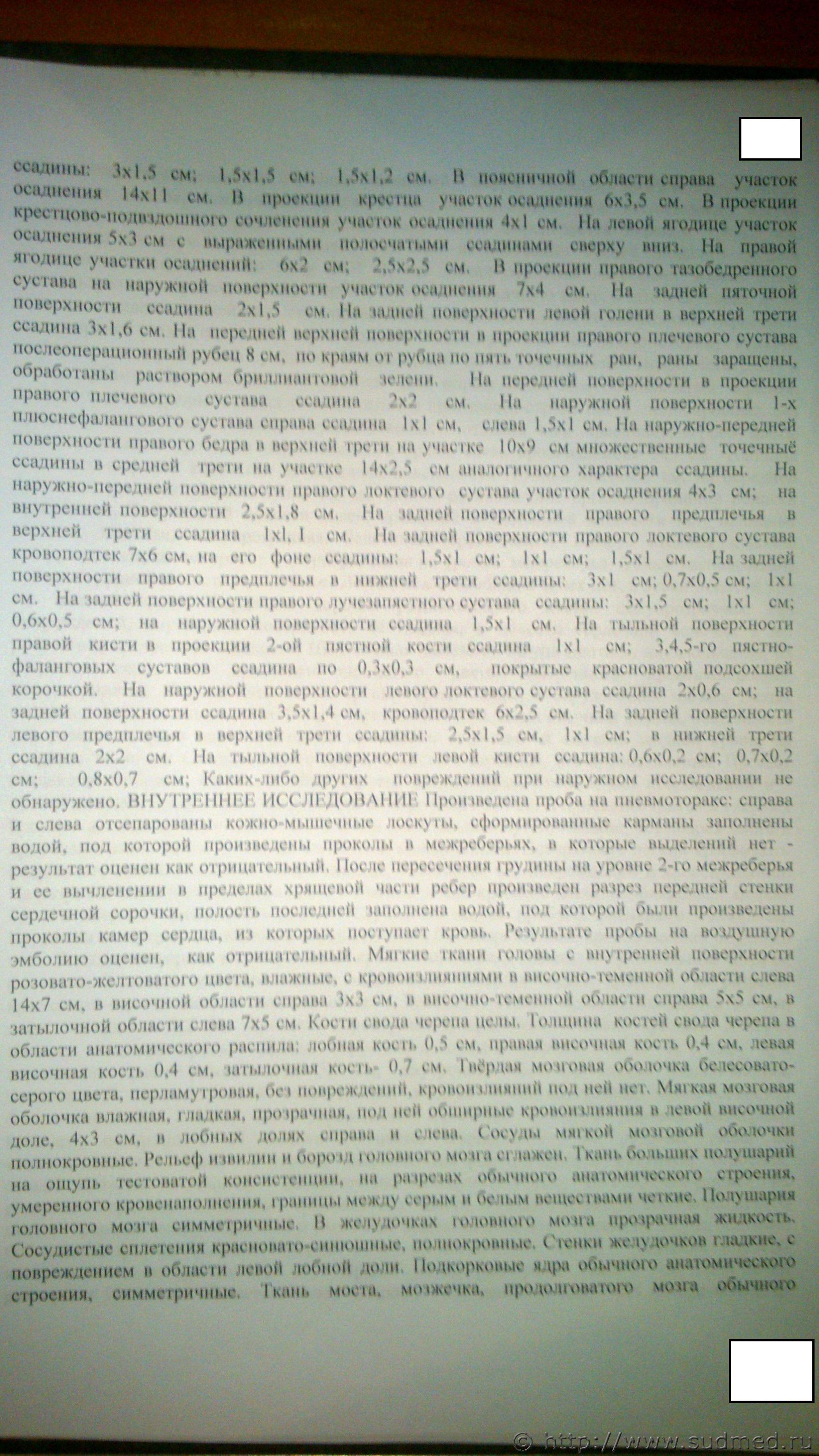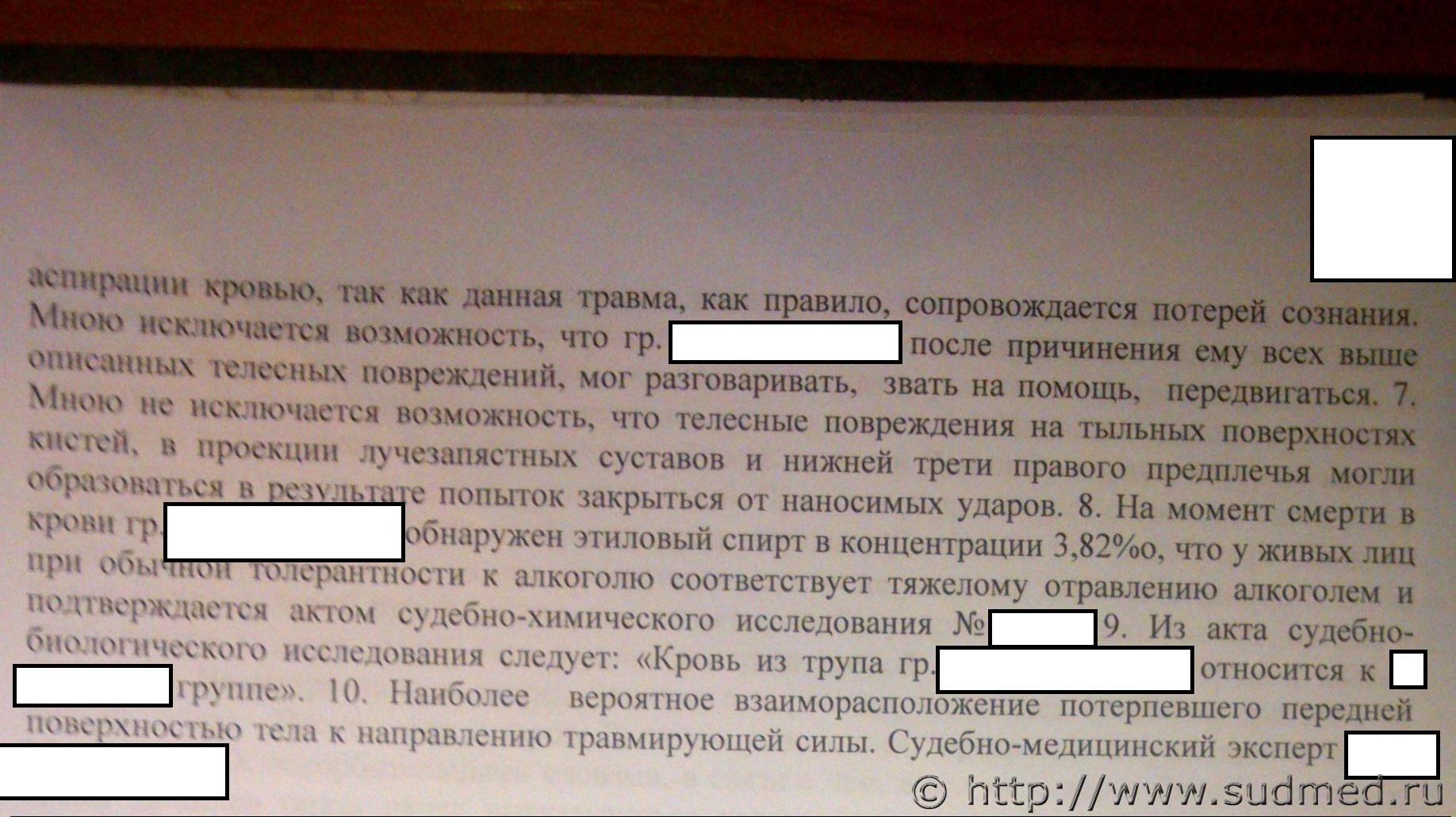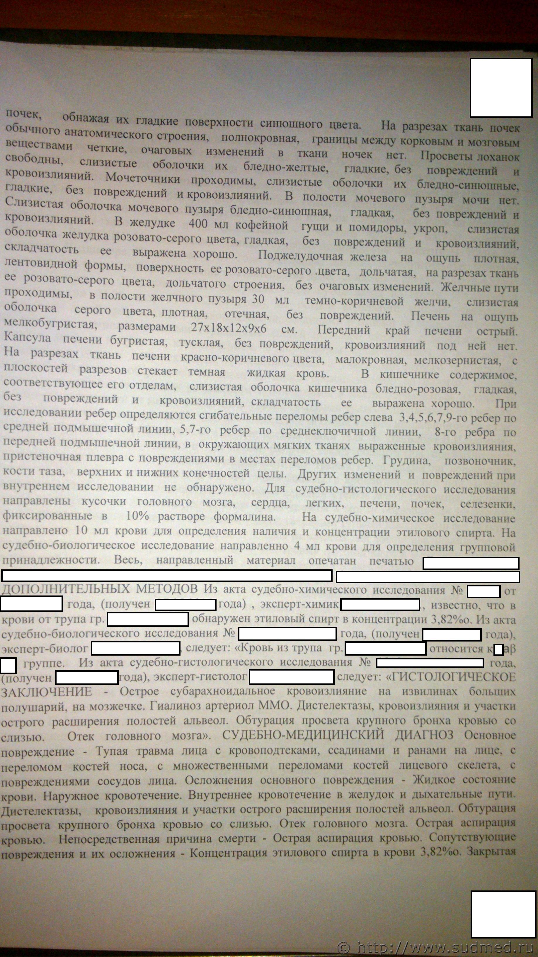 Сопутствующие повреждения и их осложнения. Концентрация этилового спирта в крови 3.82%, ЗЧМТ ссадинами волосистой части головы, с кровоизлиянием под мягкую мозговую оболочку, с изолированным переломом верхней стенки левой глазницы. Тупая травма грудной клетки с кровоподтеками на передней поверхности грудной клетки, с кровоизлиянием в мягкие ткани грудной клетки, с множественными сгиба тельными переломами ребер слева, с разрывами пристеночной плевры в местах переломов ребер, с левосторонним гемотораксом,(кровь в грудной полости 300 мл), множественные ссадины по телу. Сопутствующие заболевания и их осложнения Гиалиноз артериол мягкой мозговой оболочки. Комисионная экспертиза приходит к следующим заключениям я расписывать не буду в краткости, что все вышеуказанные повреждения, то есть от комплекса повреждений которые развили дыхательную недостаточность, травматический шок, жировой эмболии сосудов малого круга обращения и аспирации излившейся в просвет дыхательных путей, которые в своей совокупности привели к смерти. У меня вопрос почему они не могут выделить удары которые явились непосредственной причиной смерти, не рассматривают то что в крови обнаружен спирт 3.82%, что также может развить жировую эмюолию, дыхательную недостаточность, отек мозга, потерю сознания и шок, и скажите пожалуйста если бы небыло содержания алкоголя в крови 3.82% и своевременном оказании помощи можно было избежать летального исхода Заранее спасибо. |