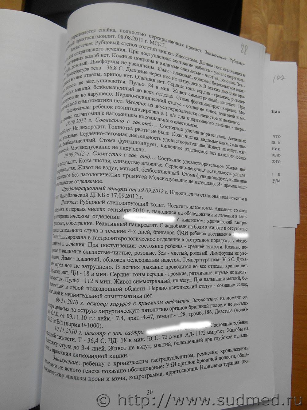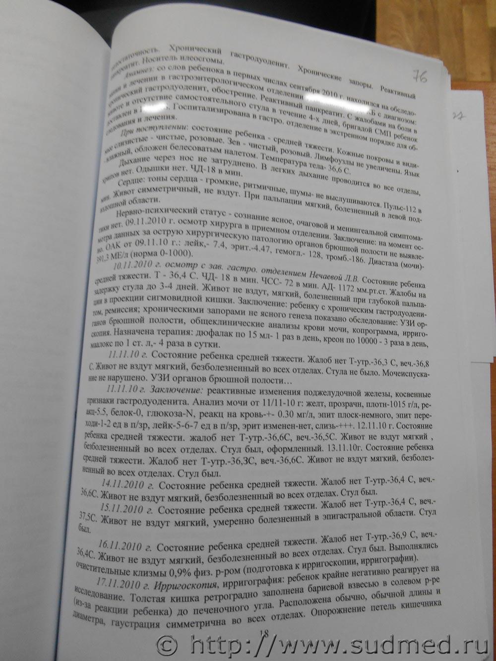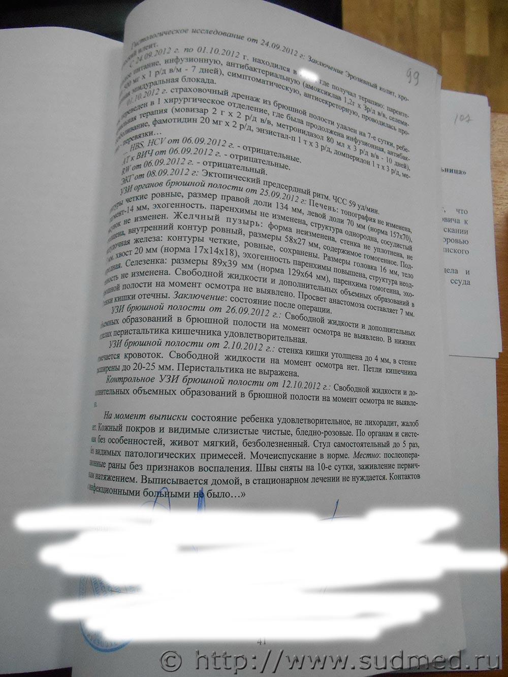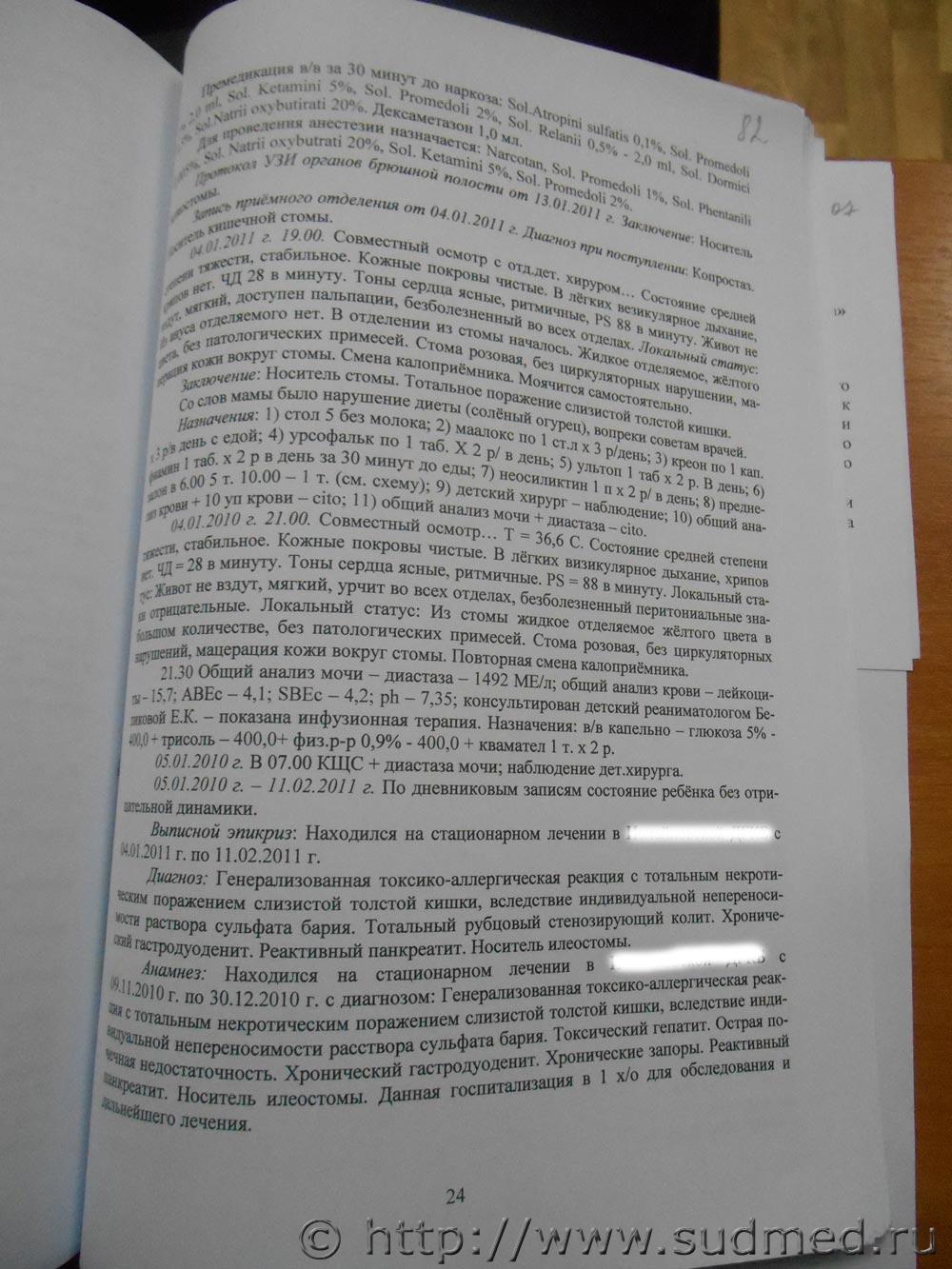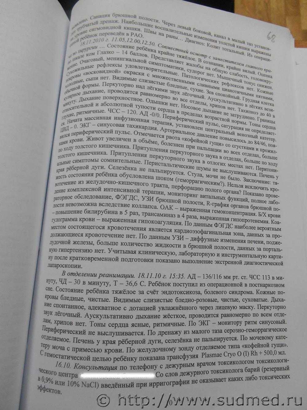 Ребенок жив. Поэтому про него патологоанатом ничего не писал. 1.Понял. 2.Интересно бы глянуть макроскопическое описание патологоанатомом толстой кишки (операционный материал,т.е.толстая кишка,которая удалёна во время операции),поскольку гистологическое описание толстой кишки (стр.100),вероятнее всего,соответствует острому язвенно-некротическому колиту + гнойный перитонит. Р.S.Вы видите в экспертизе результат бактериологического исследования кала или содержимого брюшной полости ? |