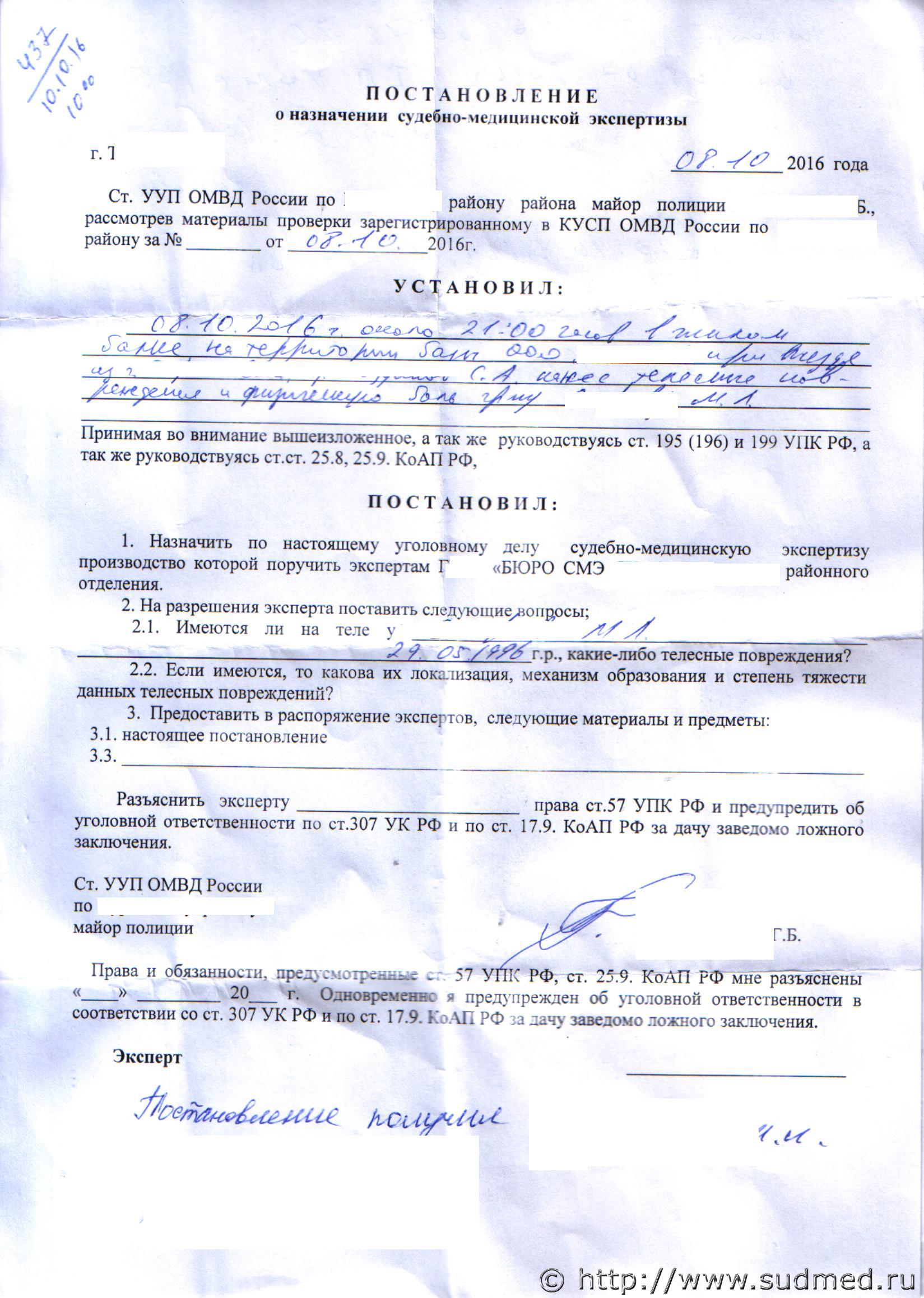 Все-таки интересно мнение юристов: может ли в рамках одной экспертизы предупреждать по двум кодексам? По-моему, нет. Человек не может нести ответственность сразу по двум кодексам? Не исключено, что проверка проводится как по статье "Побои" (ответственность по УК РФ - ст. 116), так и по статье "Оскорбление" (КоАП РФ, Статья 5.61). Так что ничего особенного не вижу. А на счёт того, если эксперту предоставили "Постановление о назначении экспертизы" - что оформлять "Акт СМО" или "Заключение эксперта", так этому учат в институте или на худой конец в интернатуре. Бармен не догоняешь, так как обучен только составлять ядовитые коктейли. |