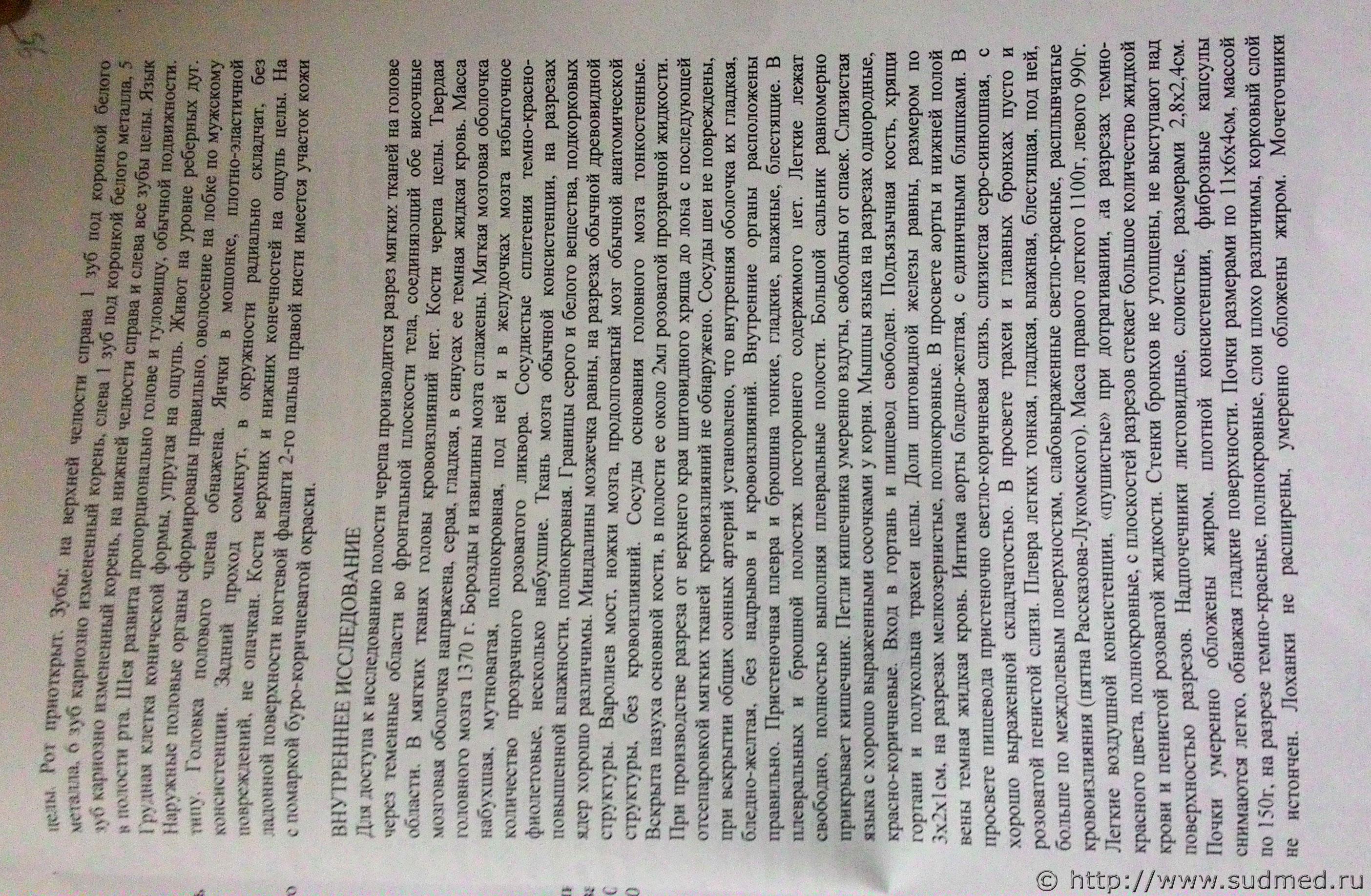 Это всё что удалось сфотографировать из заключения СМЭ. Плохо. Нужны др.страницы и гистологический Акт. повторная экспертиза ничего не покажет? Как ответить на Ваш вопрос,если Вы предоставили лишь половину Акта судебно-медицинского исследования трупа ? Да ещё не хватает и полного гистологического Акта. Вы не даёте необходимой информации для ответа на Ваш вопрос. Пока тему закрыл. Когда у Вас будут все документы,обратитесь к любому модератору и тему откроют. |