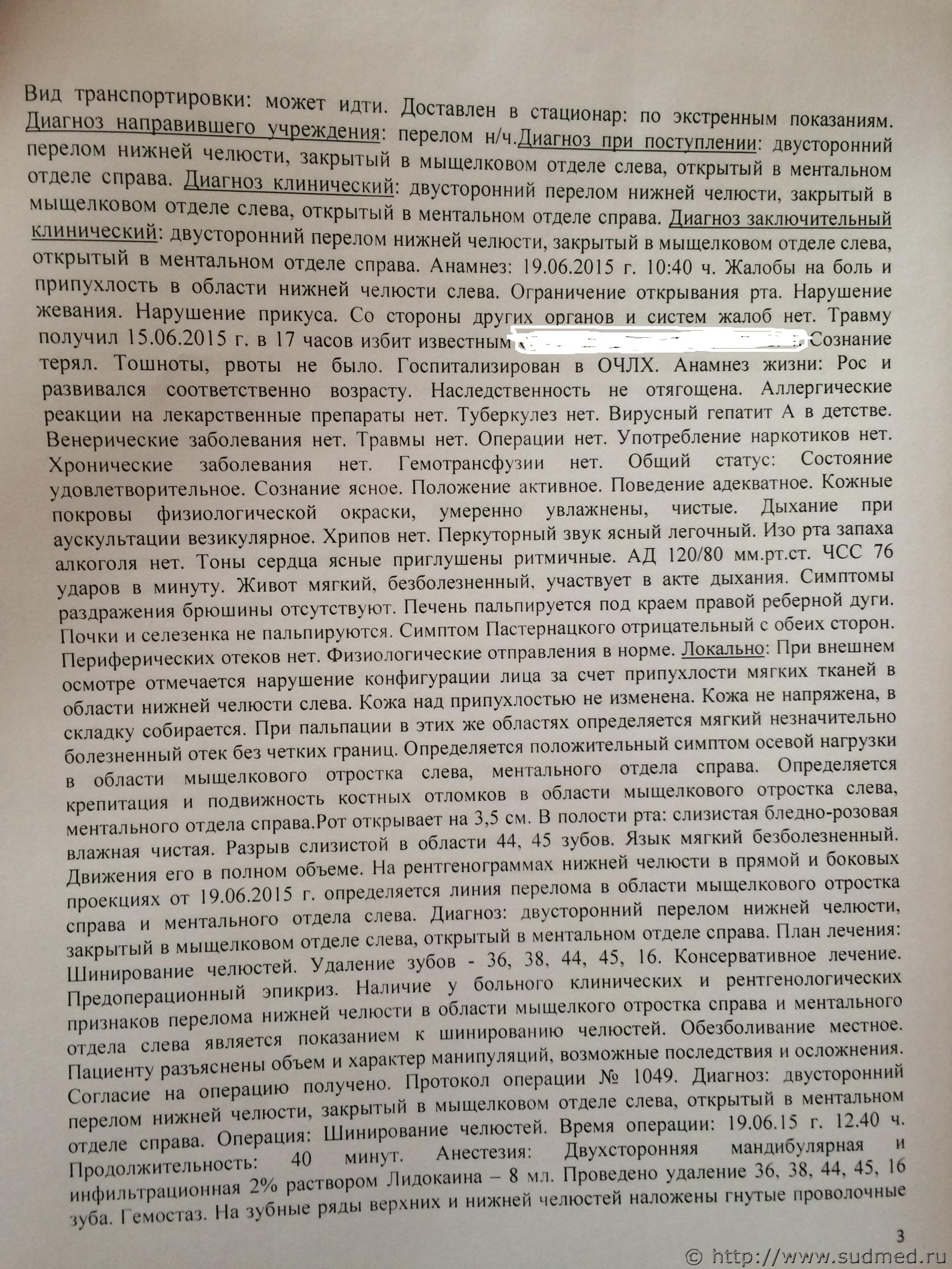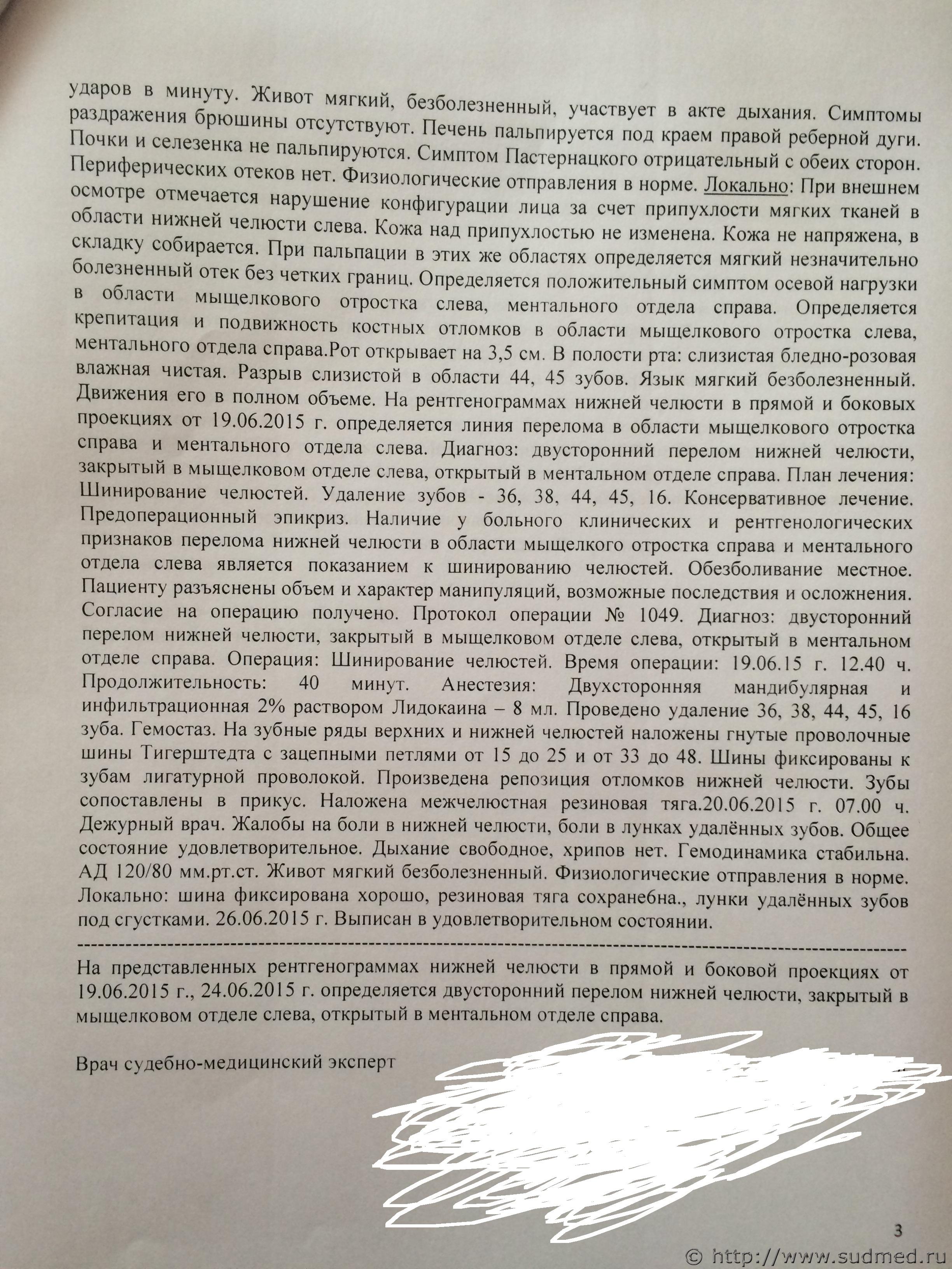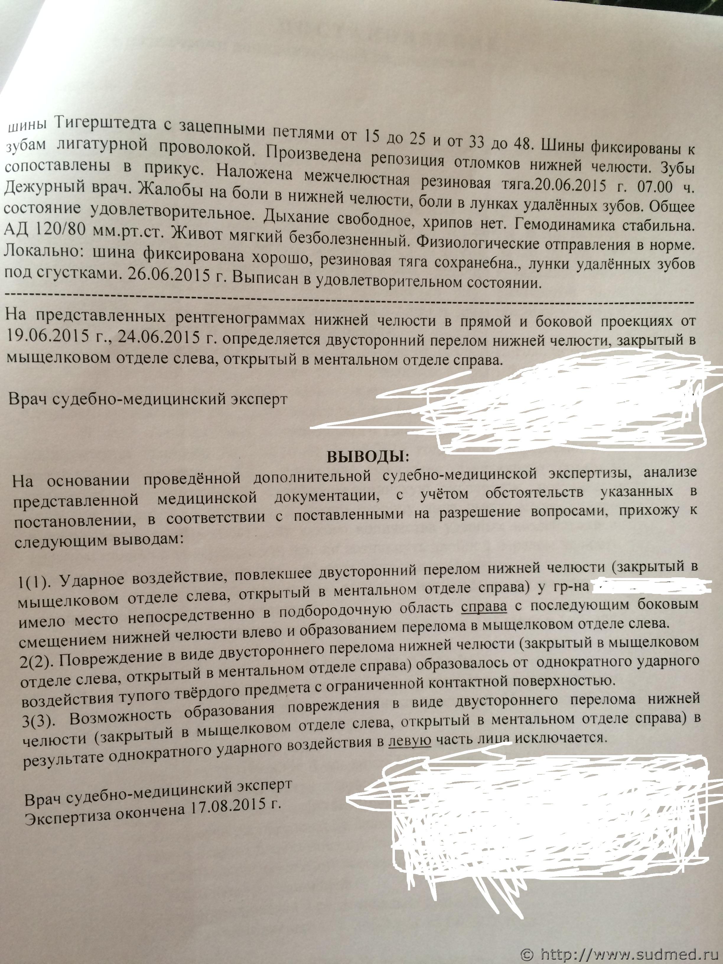 Цитата образовался двойной!!!! перелом нижней челюсти от одного удара!!!! Как такое возможно вообще!!!??? Вы имеете намерение доказать в суде, что было нанесено два (или больше) ударов? Это не облегчит процессуальное положение подсудимого! Образование подобного двойного перелома от одного удара вполне возможно. О возможности и закономерности формирования двустороннего перелома нижней челюсти от однократного травматического воздействия есть масса серьезной судебно-медицинской литературы. Наверняка, когда-то видели как ломается в руке самая обыкновенная сушка: давим на неё сверху и снизу, а она распадается на 4 части, в том числе 2 линии разлома проходят там, где вовсе нет наших пальцев. Так и нижняя челюсть, представляющая собой, приближенно, систему дуг с зафиксированными концами, закономерно может сломаться не только в месте приложения силы, но и на отдалении, в местах, где формируются зоны наибольшей концентрации силы. Поищите в Интернете "механизмы переломов нижней челюсти" и т.п. - там все это подробно и с картинками описано. Цитата Почему вред здоровью был определён как средней тяжести по признаку длительного расстройства его на срок более 3-х недель, ведь пострадавший пролежал в больнице всего!!! 7 дней. Как такое может быть??? Длительность расстройства здоровья, вследствие конкретной травмы, определяется не исходя из продолжительности лежания в больнице. Такой перелом не срастается быстрее, чем за три недели, в пределах трех недель не происходит функционального восстановления такой травмы челюстно-лицевой области. Через 21 день после этого перелома человек не сможет свободно открывать рот, нормально кушать (речь не о манной кашке или мясном пюре, а, об обычной пище) и т.д. Об этом хорошо написано во множестве книг по челюстно-лицевой хирургии и травматологии, в интернете об этом так же есть. Поэтому, перелом нижней челюсти, по признаку длительного расстройства здоровья расценивается как вред здоровью средней тяжести. Если есть желание, узнайте у пострадавшего, где и сколько он еще лечился после выписки из больницы, когда он был признан трудоспособным и выписан к труду. Цитата В своём заключении эксперт указал, что при падении с высоты собственного роста такие повреждения не возможны!!! В тексте вопроса указано о падении с высоты собственного роста с приданным ускорением и о "соударении с твердой поверхностью". Даже только отсутствие ушибленной раны, ссадин в месте такого предполагаемого удара позволяет исключить версию падения с ударом о "твердую поверхность". Крайне абстрактную версию. В случае конкретизированной версии с четким указанием как именно упал, какой конкретно областью ударился, обо что именно и т.д., вероятно, можно будет добавить еще некоторые аргументы, показывающие несостоятельность получения этой травмы при падении. Не буду фантазировать о том, чего нет (конкретной версии падения). Цитата У нас (меня, сына, нашего адвоката) от увиденной "филькиной грамоты" глаза на лоб повылазили!!! Вас и Вашего сына абсолютно в этом понимаю. Вы оба, с участием грамотного адвоката, - единственные участники процесса заинтересованные в юридической защите Вашего сына. Остальные - представляют обвинение (прокурор, потерпевший и его адвокат) или же процессуально нейтральны (суд и эксперт). Разумно изначально критически подходить к 