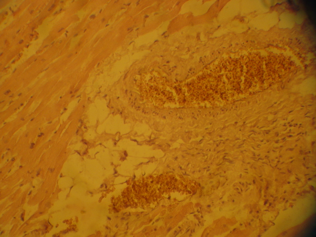 Миокард. Участок вокруг сосудистого пучка.Полнокровие.Разрастание соед ткани (кардиосклероз),небольшое стромальное ожирение (липоциты)