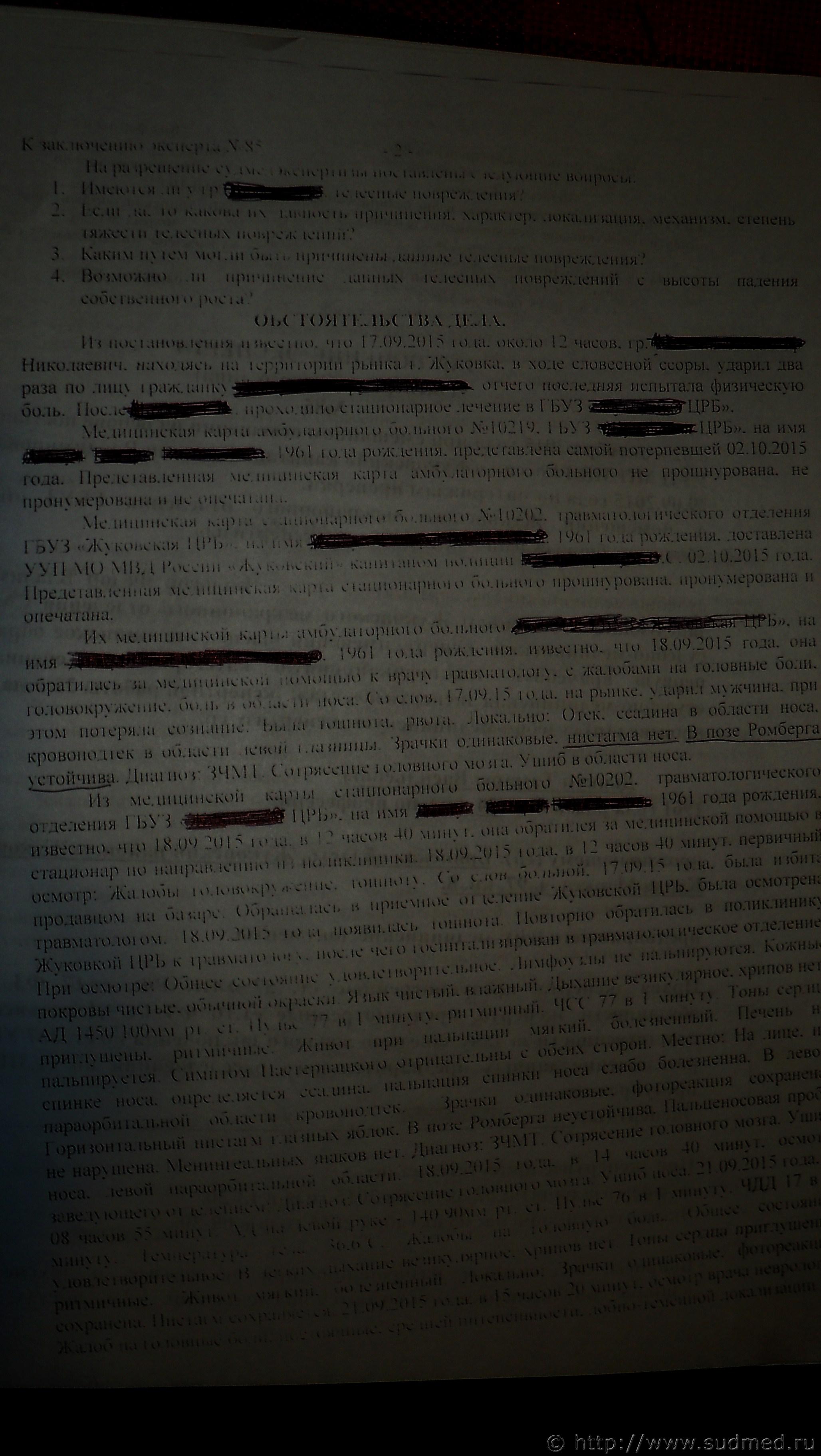 Хорошо. Тема пока будет открыта. (Вероятно, смогу прокомментировать вечером в четверг или вечером воскресенья). Вскоре после получения сотрясения головного мозга (через несколько минут - несколько часов) состояние человека и возможность совершать им описанные Вами действия могут быть весьма разными: кто-то будет заторможен, вял, сонлив, слаб, бледен, ощущать сильную головную боль при, деже, негромких звуках, резь в глазах от не слишком яркого света, "шататься как пьяный" и т.п., кто-то - может чувствовать себя относительно удовлетворительно и, собрав воедино свои силы, эмоции, темперамент, собственное понимание ситуации, будет "лезть в драку" и т.п. Сотрясение головного мозга не имеет абсолютно стандартной клинической картины. Слишком сложный объект повреждения (головной мозг) и повреждается он совершенно неодинаково, в зависимости от его отделов, на которые пришлась наибольшая концентрация травмирующей силы, от её направления и, следовательно, колебаний вещества головного мозга, его взаимодействия с другими внутричерепными структурами, от индивидуальных анатомических и физиологических особенностей. Если сотрясение головного мозга имеется фактически. Часто (больше половины случаев) выставленный лечащим врачом диагноз сотрясение головного мозга не подтверждается при экспертизе: эксперт исследует и оценивает описанную в медицинских документах объективную симптоматику, а не сам по себе диагноз. Если симптоматики нет, а есть только жалобы на головную боль, тошноту и т.п., то такой клинический диагноз не является основанием для судебно-медицинского диагноза. На этом теоретическая лекция окончена. Будет заключение - будет консультация конкретного случая, относящегося к делу: суду нужны факты и их анализ, а не общие рассуждения. Ну вот сходил в суд взял копии документов к моему удивлению обстоятельства дела в СМЭ не соответствуют обстоятельствам описанных свидетелями. К примеру со слов потерпевшей 17 сентября её не толкнули а нанесли два удара,после была потеря сознания и рвота,тошнота хотя диктофонная запись и свидетели это опровергают она бегала,орала,материлась и провоцировала дальнейшую драку . По самой экспертизе тоже странности на следующий день после конфликта 18 сентября потерпевшая обратилась в поликлинику Зрачки одинаковые,нистагама нет.В позе Ромберга устойчева.Но диагноз ЗЧМТ.сотрясение головного мозга В тот же день уже после в стационаре почему то В позе РОмберга неустойчева,горизонтальный нистагам глазных яблок.Лимфоузлы не пальпируются.Язык чистый влажный.Живот припальпации мягкий ,болезненый Печень не пальпируется.Симптом Пастернацкого отрицателен с обеих сторон .Зрачки одинаковые ,фотореакция сохранена.ПАльценосная проба не нарушена..Менигеальных знаков нет.Диагноз ЗМЧТ Сотрясение мозга Ещё у ней оказалась 3ая группа инвалидности по общему заболеванию |