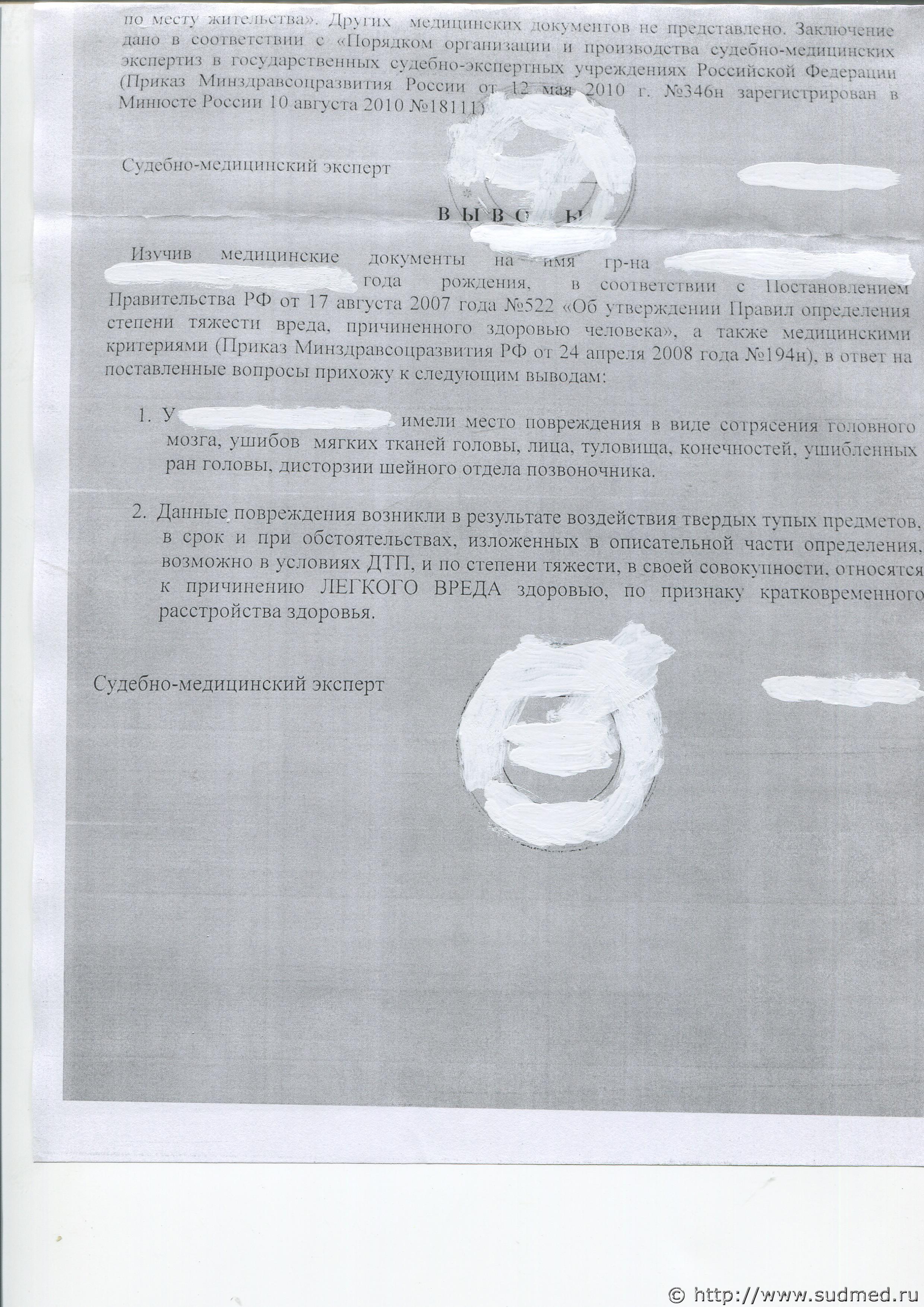 Частично. Т.е. при исследовании не обнаружено никаких объективных медицинских данных, которые бы подтверждали "ушибы мягких тканей головы, туловища ...". Морфологически подтверждается только один ушиб мягких тканей - в области левого коленного сустава (отек). Дисторзия шейного отдела позвоночника также не обоснована (жалобы на сильную боль в шее - это слова, а не объективная симптоматика). По поводу сотрясения головного мозга и ушибленных ран - все верно. Степень тяжести вреда здоровью определена верно. Потому как, что сотрясение головного мозга, само по себе, что раны (с учетом их размеров + "дно - апоневроз", потребовавшие ушивания), сами по себе, что все это в совокупности - легкий вред здоровью. Ни больше, ни меньше. Мечтать о возможности изменения этой степени тяжести - дело пустое и нереальное. Можно, конечно, ходатайствовать о повторной экспертизе. Вероятно, её будут делать более подготовленные эксперты и судебно-медицинский изменится так, как я написал выше. Но, степень тяжести останется прежней. Это - ДТП, т.е., с юридической точки зрения, абсолютно ничего от этого не изменится. Т.к. состав административного нарушения заключается в причинении легкого вреда здоровью при ДТП, а не в причинении конкретного числа повреждений, расценивающихся как легкий вред. Аналогично - по поводу ран. Даже Вы не сомневаетесь, что они получены при ДТП. Только механизм образования смущает. В иной ситуации - это бывает крайне важно. Но не здесь. Не буду вдаваться в сложные объяснения. Поступлю просто: предположим, что Вы, каким-то чудесным образом доказали суду, что раны вовсе не относятся к ДТП (как доказали - не знаю, моей фантазии для этого не достает, но - предположим). Остается сотрясение головного мозга. Легкий вред здоровью. Юридически - ровно то, что есть сейчас. Ни больше, ни меньше. Посоветуйтесь ст толковым юристом, специализирующимся на ДТП. |