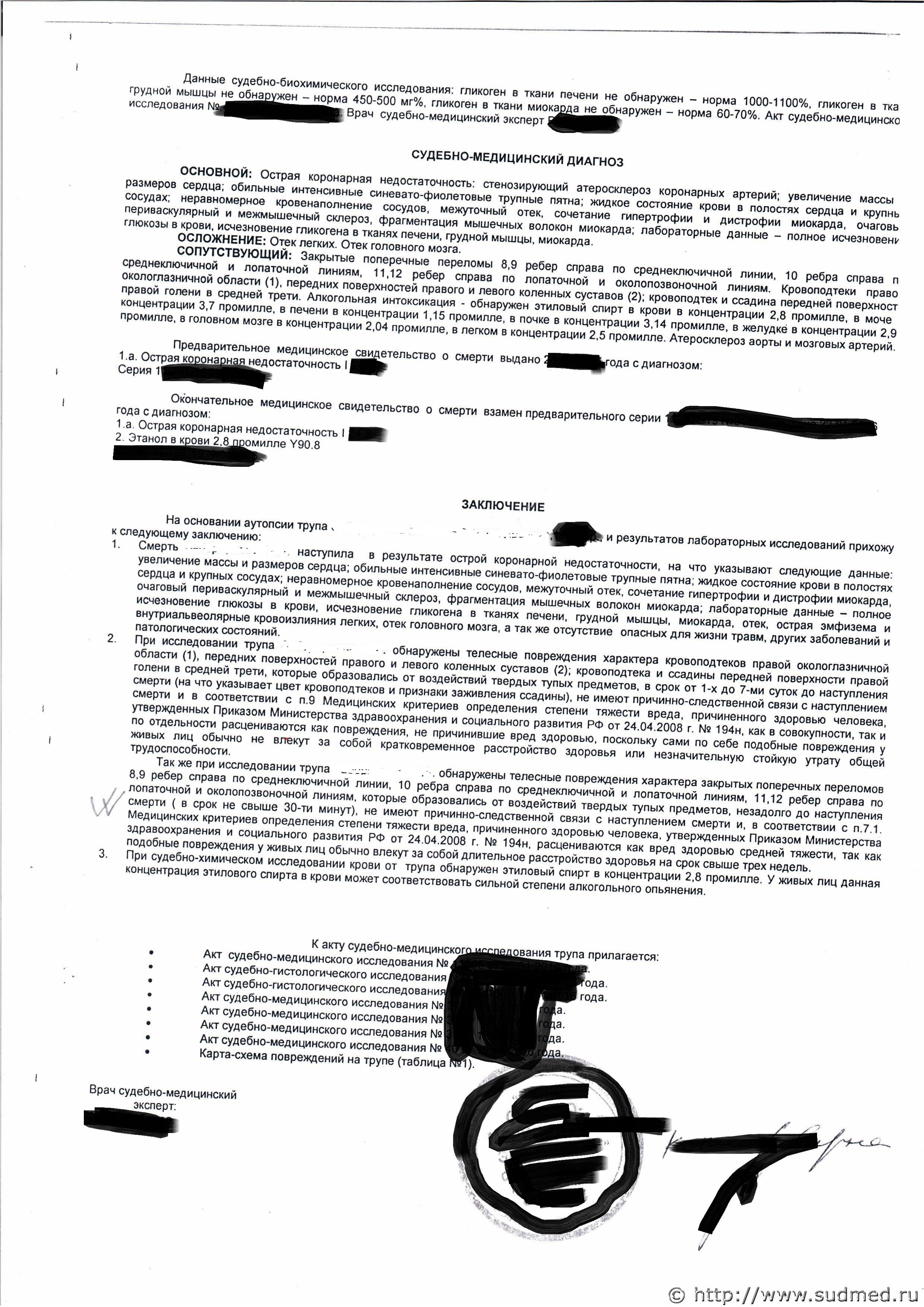 Подскажите, могут ли травмы ( переломы ребер ) привести к смерти? Описанные в Акте переломы 5 рёбер в причинной связи со смертью не состоят. Макроскопические и микроскопические изменения со стороны сердца и т.д. свидетельствуют о так называемой острой коронарной смерти (I24.8). |