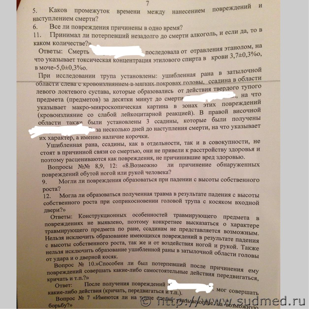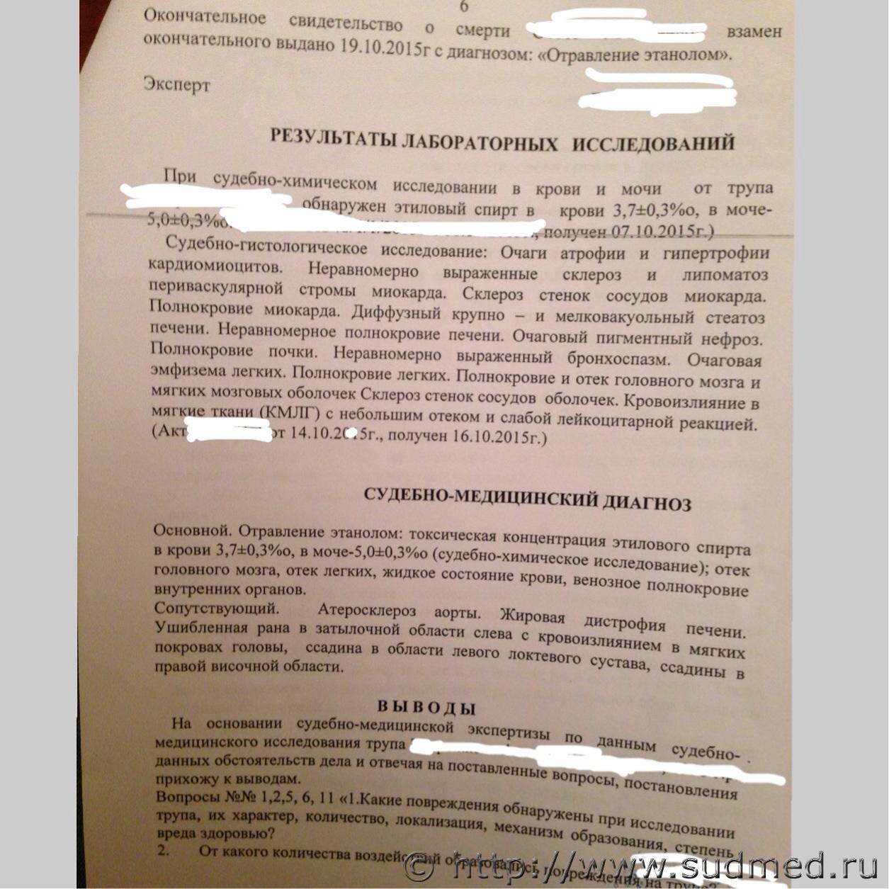Могут ли без усердия проводить экспертизу, если узнают, что человек бомж? Мог ли человек не умереть от такого содержания алкоголя в крови и моче? Может ли человек при падении в описанном мною случае сам удариться не менее 2х раз головой об косяк двери, или это скорее повреждение, нанесенное кем-то? Показывает ли экспертиза содержание фенозепама в крови? Могу ли я запросить какую-то расшифровку, либо еще какие-то данные экспертизы по отцу? |