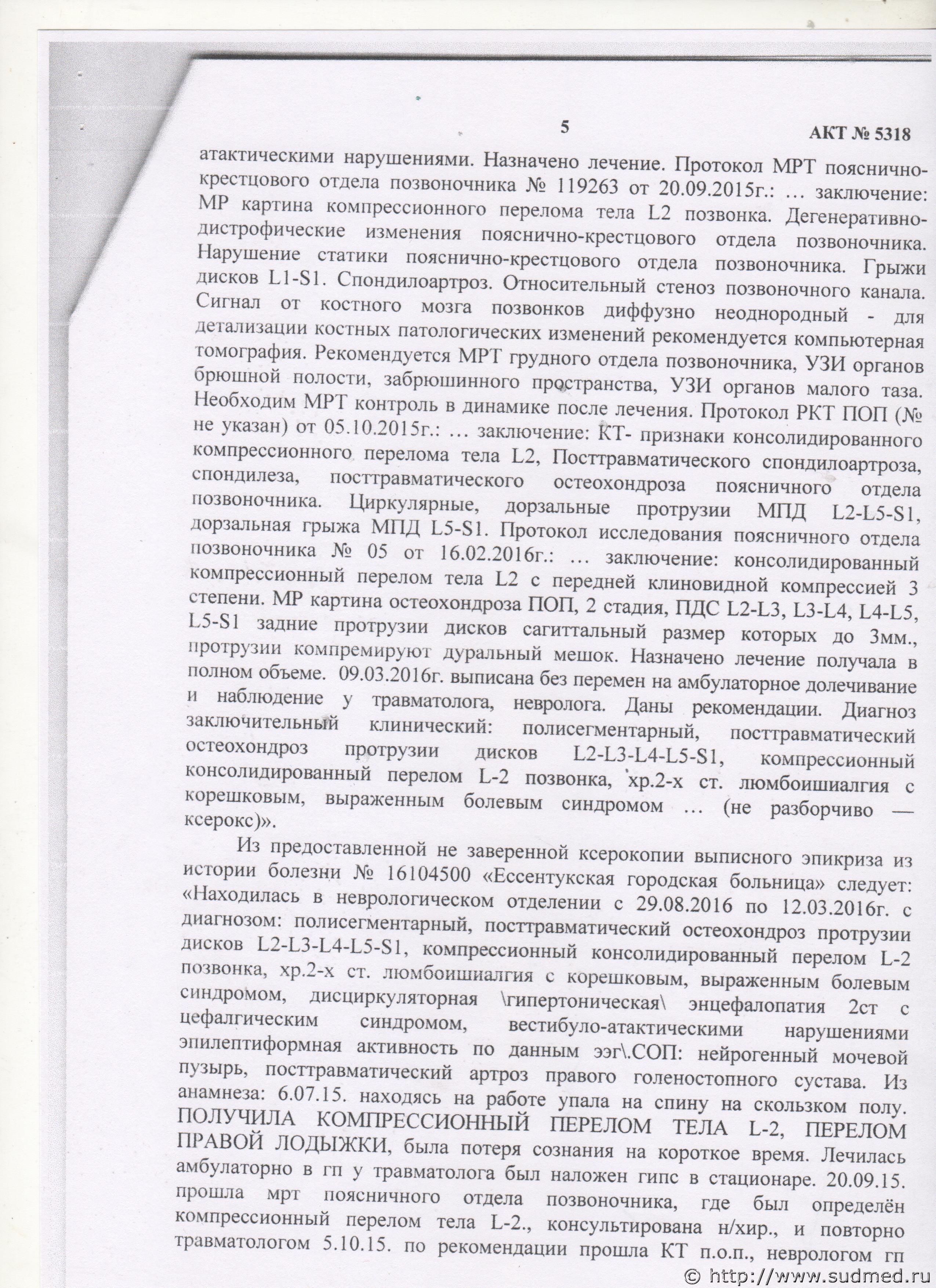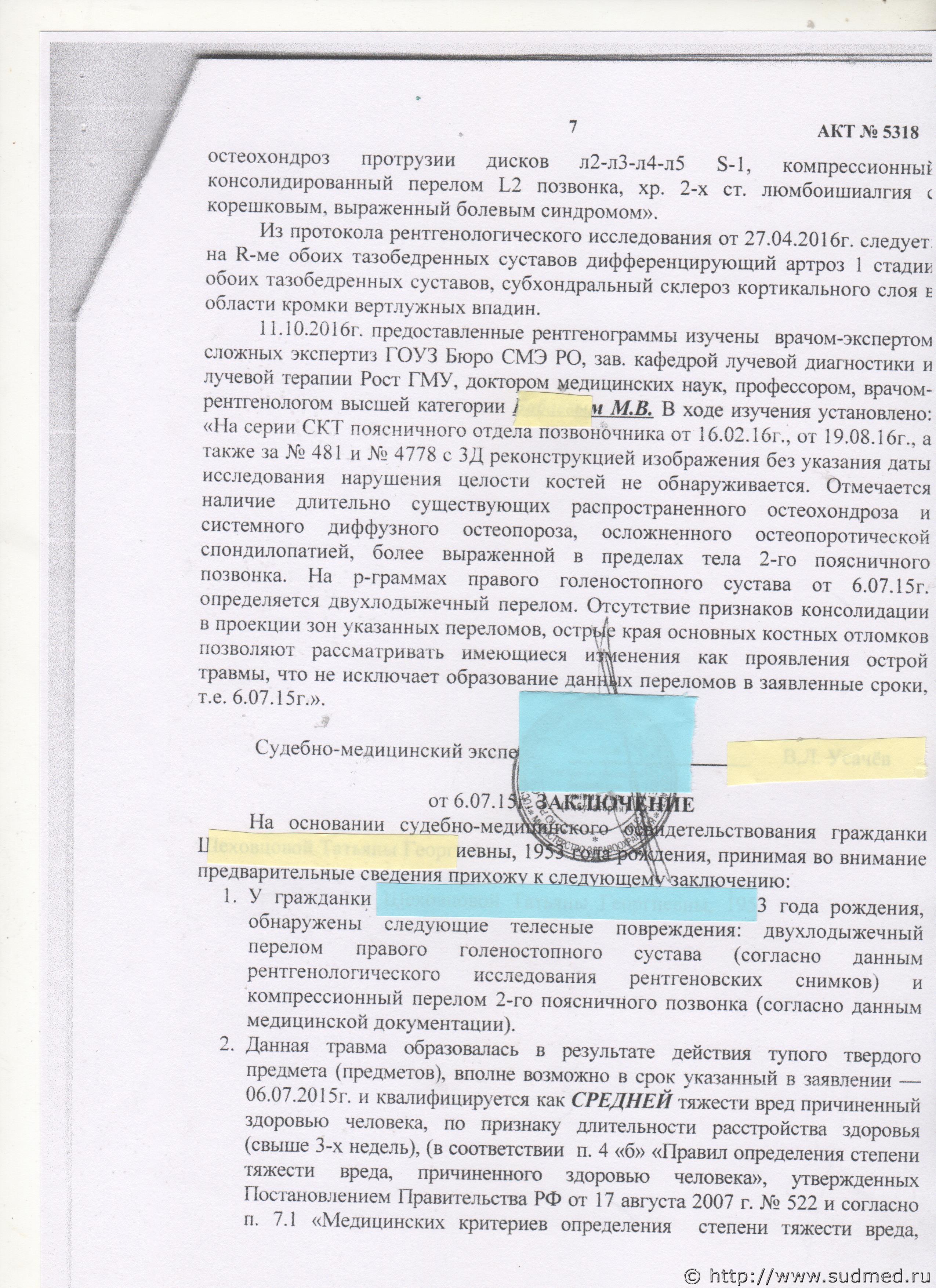И в одном и в другом Заключении эксперт делает вывод. что я не получила никаких травм в день падения : перелом ноги , они ставят за больше месяца до падения. хотя есть заключения и снимки. А перелом позвоночника за 18 мес. Проходила дополнительно СМЭ вне скоего края, Акт Судебно-медицинского освидетельствования представила выше. Спасибо. Татьяна |
