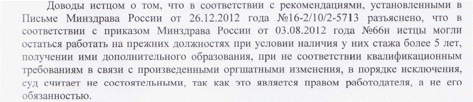 Здравствуйте. Глубокоуважаемый "alexp", Ваш довод из решения суда нужно разделить на две части, да Вы и сами это знаете. Суд не поставил под сомнение, что специалист не может продолжать работать, суд счел несостоятельным требование к работодателю, именно по оргштатным мероприятиям, так как это относится к его компетенции, т.е. он (работодатель) может это проводить, т.е. изменять штатную численность, вводить и сокращать должности и злоупотребляет этим сплошь и рядом, если хочет избавиться от "неудобного" сотрудника или в рамках "оптимизации" здравоохранения, но это уже относится, насколько я понимаю, не к федеральному, а к местному региональному, муниципальному уровням со всеми вытекающими ... Эх, надо было задать такой вопрос на прямую линию... |