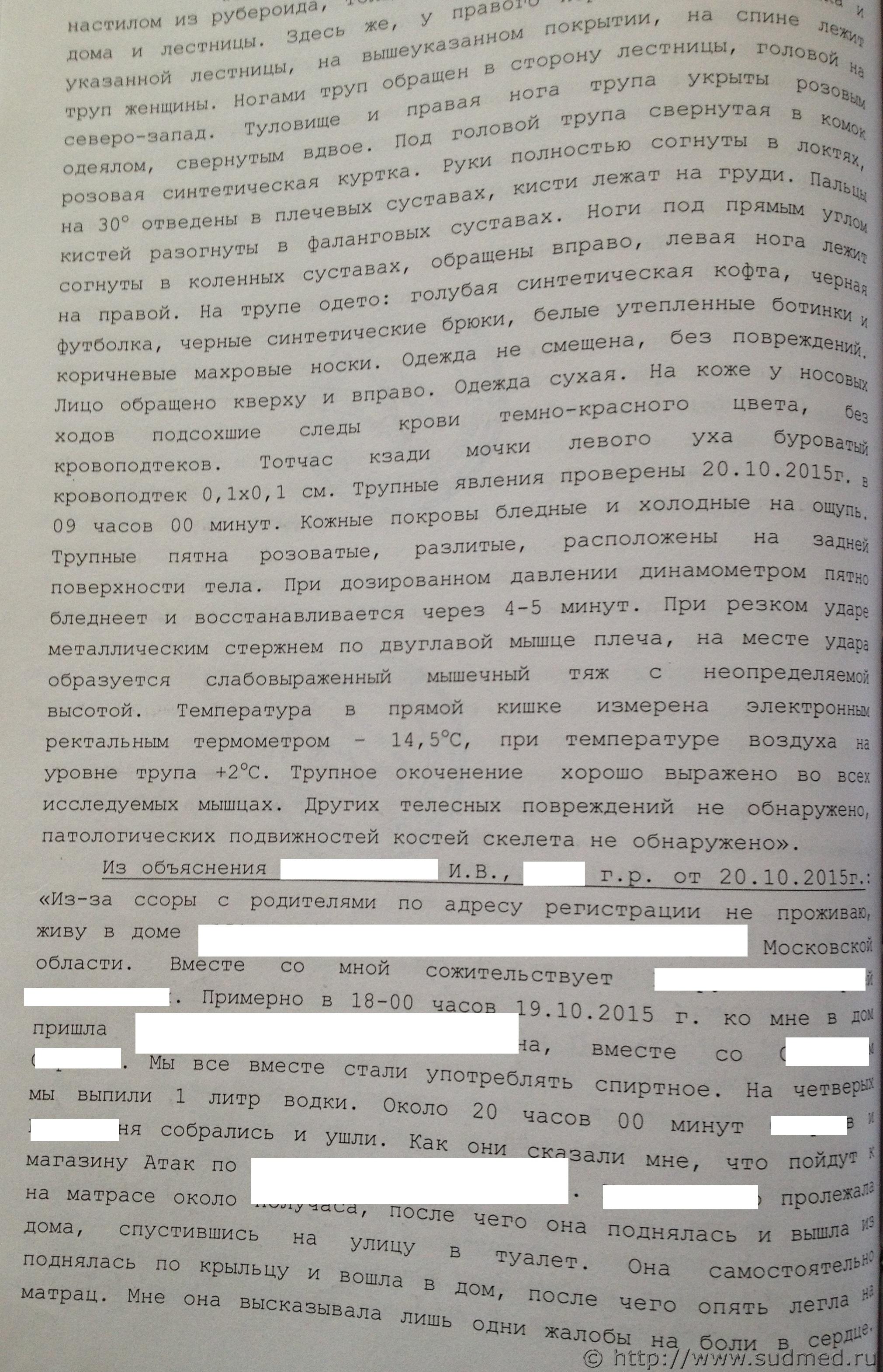 Обстоятельства: Мужчина нанес два удара правой ногой по левой части головы женщине, а также два удара по лицу руками (левой и правой), примерно, через час после этого женщина упала, спускаясь с лестницы садового домика (само падение не видели, но сразу после падения она лежала на левом боку, т.е. я предполагаю, что ударилась левой стороной), женщина была в тяжелой степени опьянения, в результате женщина умерла. Судмедэксперт установил следующее: 1.1. закрытая черепно-мозговая травма: ссадины в лобной области, кровоизлияния в мягкие ткани лобной области, кровоподтек в области левого сосцевидного отростка и на левой ушной раковине, перелом костей носа, кровоподтек на верхнем веке левого глаза, очаговое субарахнаидальное кровоизлияние на лобном полюсе левого полушария головного мозга, разрыв соединительное вены у сагиттального синуса, правосторонняя субдуральная гематома (169 гр) 1.2. Признаки сдавления головного мозга гематомой (кровью): отек-набухание и дислокация головного мозга в большое затылочное отверстие, субарахноидальные кровоизлияния на затылочном полюсе правого полушария, на основании височной доли правого полушария головного мозга, вторичные кровоизлияния в стволовой отдел головного мозга. При этом эксперт делает вывод о том, что данные повреждения не могли образоваться от падения из вертикального или близкого к нему положения. Между тем, удары наносились в левую часть головы, в связи с чем не может ли возникшая правосторонняя субдуральная гематома (169 гр) служит признаком "противоудара", который возникает при падении о твердую плоскую поверхность, так как есть основания полагать, что женщина упала левой стороной? Прошу помощи в этом вопросе. Может быть нужно еще предоставить информацию. |