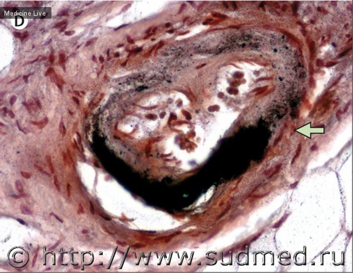ФОТО 6. Депозиты кальция в виде темных гранул в стенках артериол