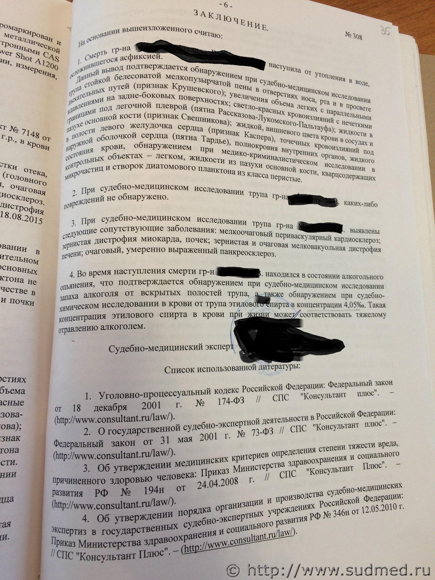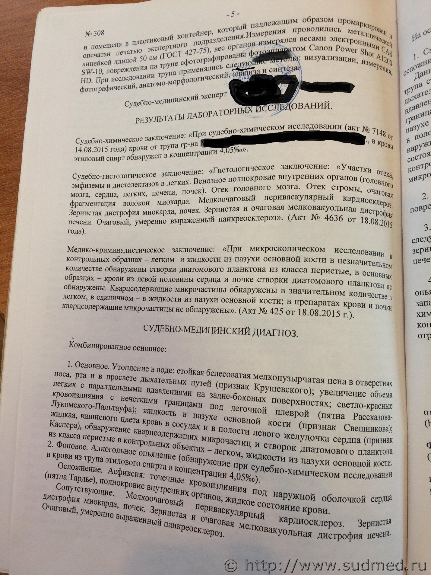 R96.0 - Мгновенная смерть. Таким кодом эксперты ВОЗ пользоваться не рекомендуют. С буквой "Р" коды перинатальной патологии. Давайте Акт и,пожалуйста,листы поверните вертикально,а то консультантам неудобно читать. Патологоанатом в морге после вскрытия говорил, что скорее всего сердце, а в итоге в СМИ оказалось утопление. Каким должно быть тело после 2 дней в воде? Почему нос в крови был? (Есть фототаблица с места осмотра трупа следователем) Откуда 4, 05 промилле алкоголя в крови. В 14.00 абсолютно трезвый ушел из дома, в 17.00, по словам сожительницы зашел в воду. Сколько же нужно выпить, чтобы такое количество показало? Эксперт не указал травму ключицы, 22 июля разрыв связок у него произошел, он вообще не мог пошевелить рукой, а тут какой-то заплыв. |